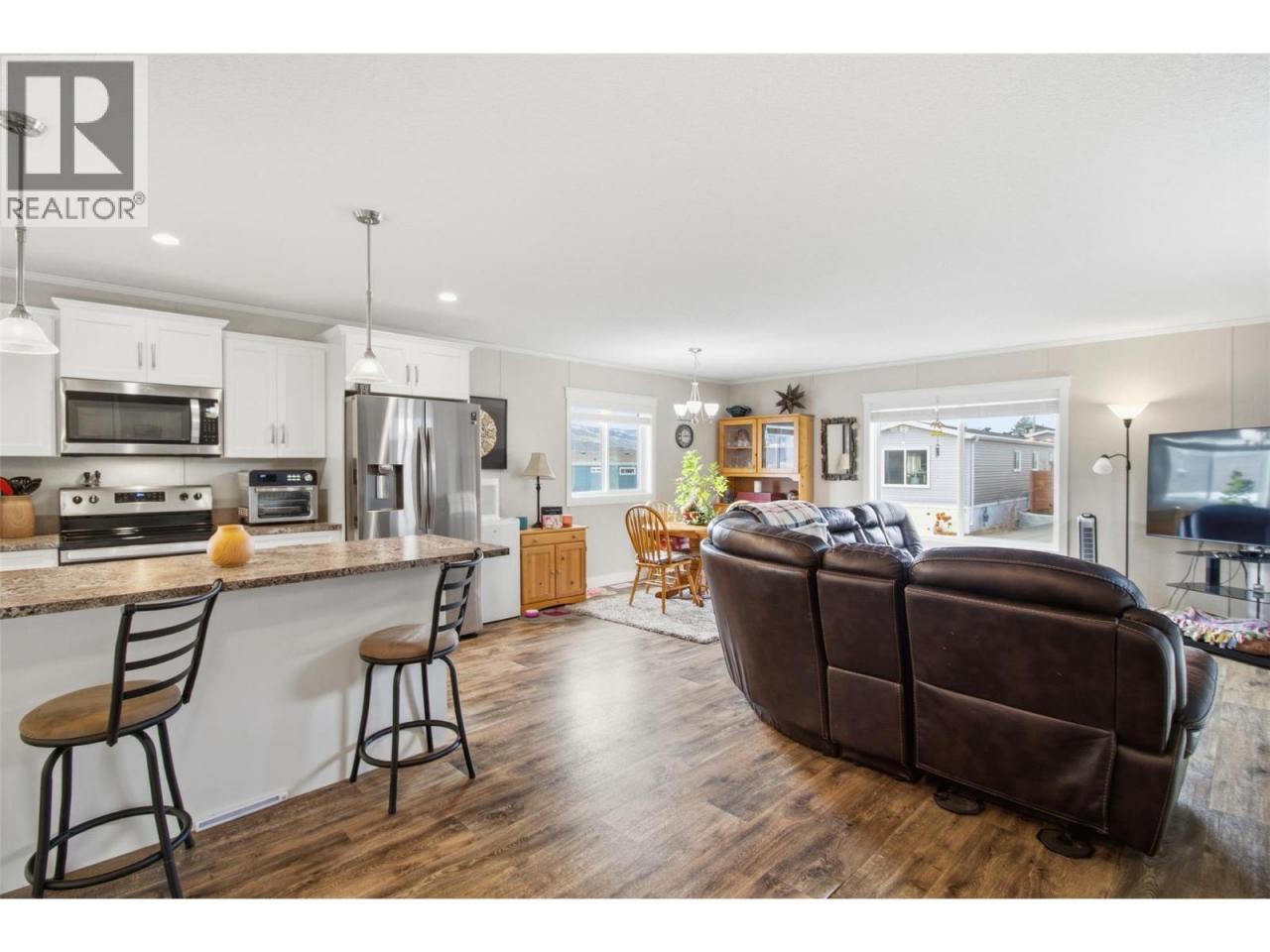 Located in South Bend Estates, just 8 minutes from Downtown Kamloops, this beautifully designed and modern home boasts 1,160 sq ft of living space, 2 bedrooms & 2 full bathrooms, and is completely move-in-ready! Practically brand new - manufactured in 2021, the home was designed with low maintenance in mind. The exterior is xeriscape landscaped and offers a large sundeck overlooking the green space and valley. As you step into the entry of this bright & spacious floorplan you'll feel at home in this open concept living/kitchen/dining space with large windows! The kitchen is perfect for entertaining and features an island as well as a pantry and stainless steel appliances. The large primary bedroom has a two closets and 4 pc ensuite. Lots of parking including RV parking available in the complex. Low pad rent $450 per month, includes water, septic and garbage. Dogs and cats are allowed - see bylaws! (id:6769)