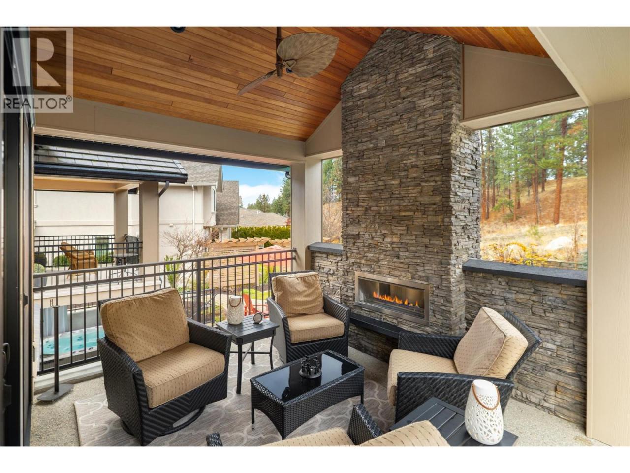 Privately positioned in an exceptionally quiet setting with no neighbours in front or behind, this thoughtfully designed residence is surrounded by mature trees and meticulous landscaping, offering a rare sense of seclusion. Built with longevity and quality in mind, the FireSmart Hardie Board exterior, concrete tile roof, Loewen windows, and handcrafted fir front door set the tone for the level of finish carried throughout. Engineered hardwood flooring, solid core doors, and all-wood casings create a cohesive, timeless interior. The kitchen is the heart of the home, featuring Brazilian soapstone countertops, solid maple cabinetry, an expansive custom island, six-burner gas range, Thermador appliance package, and a dedicated beverage centre. Indoor-outdoor living is seamless with a covered upper deck complete with gas fireplace and BBQ hookup. The walk-out lower level offers impressive ceiling heights, a custom wet bar, gas fireplace, theatre room, and access to a private patio with Beachcomber hot tub and Restoration Hardware fire bowl. A hybrid heat pump/gas furnace, EV-ready 3 car garage, grade-level windows, and thoughtful accessibility features further enhance this exceptional home designed for comfort, privacy, and everyday enjoyment. Set within the prestigious Gallaghers Canyon community, residents enjoy an unmatched lifestyle with world-class golf, scenic walking trails, and a strong sense of community—just minutes from Kelowna’s amenities. A rare combination of privacy, craftsmanship, and lifestyle — this is a must-see to be fully appreciated. (id:6769)