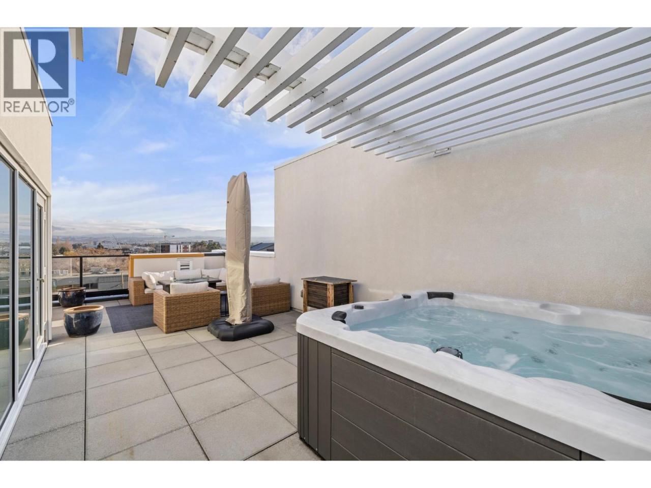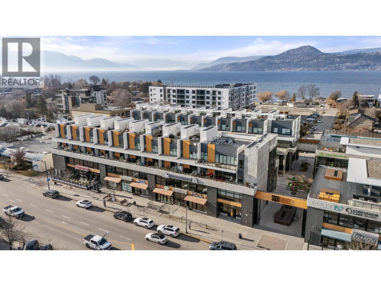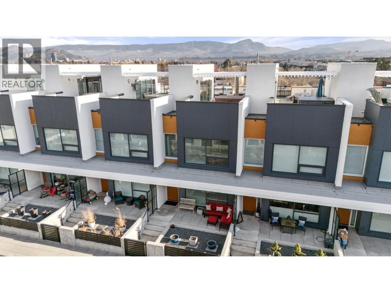 Welcome to luxury living at SOPA Square. This exceptional townhouse-style residence offers breathtaking mountain views, beautiful eastern exposure with glowing morning light, and rare privacy—highlighted by your own rooftop deck complete with a hot tub and peek-a-boo lake views. The interior delivers a true boutique, high-end feel with premium Wolf and Fisher & Paykel appliances, a massive kitchen island, and an open-concept layout that flows seamlessly to a spacious outdoor deck—perfect for entertaining or unwinding against a stunning mountain backdrop. Featuring two generous bedrooms, each with its own ensuite, plus a large den easily convertible to a third bedroom, this home lives large and feels private with its own entrance and patio. Enjoy the convenience of two secure parking stalls with extra-high ceilings—ideal for oversized vehicles and trucks. Set within a safe, secure, and beautifully landscaped third-level courtyard, residents also enjoy access to SOPA’s first-class amenities including a lakeview lap pool, hot tub, gym, fire pit lounge, and private boardroom. All of this is located in the vibrant Pandosy Village, just steps to boutique shopping, restaurants, coffee shops, yoga studios, and more. (id:6769)