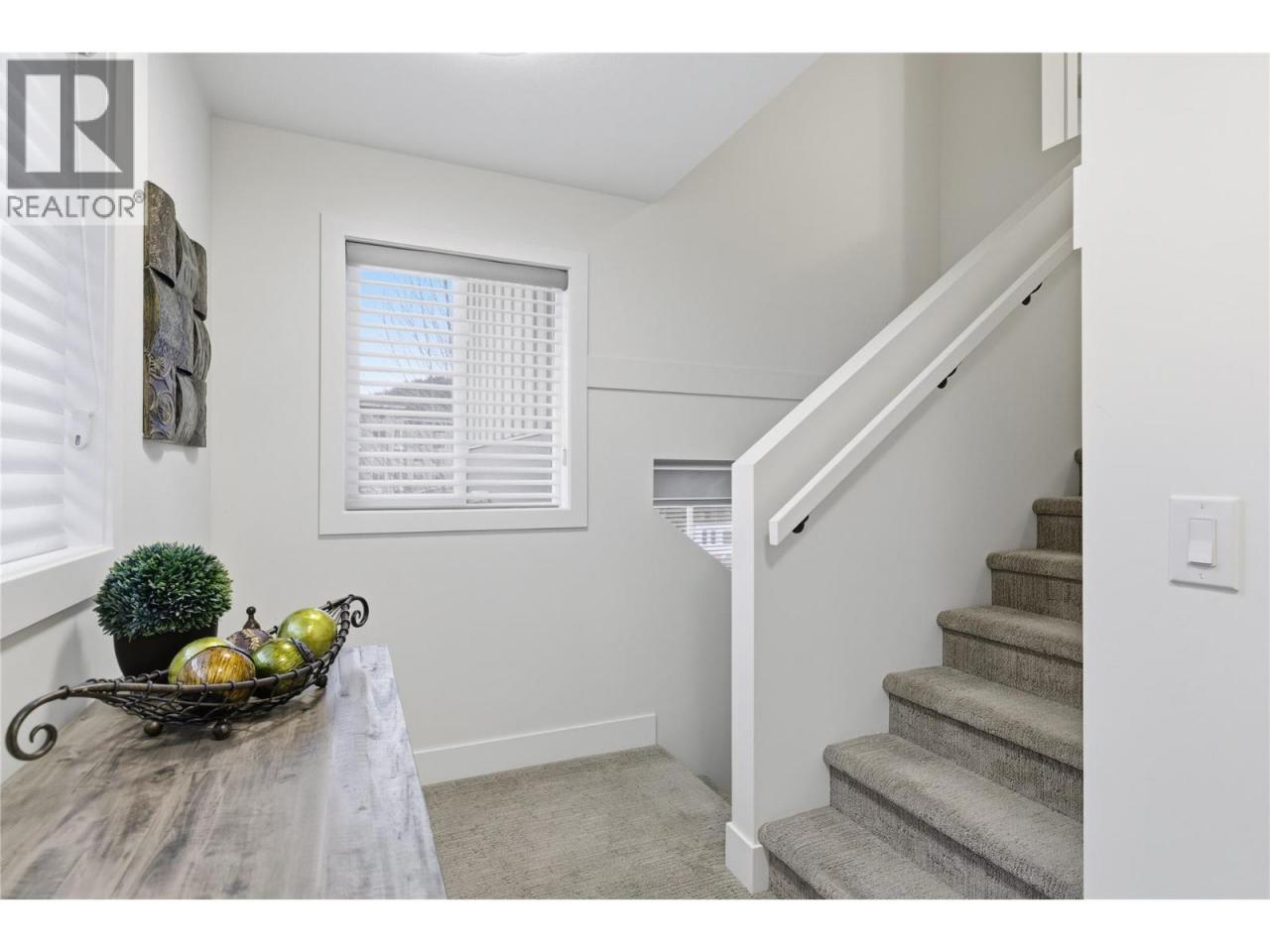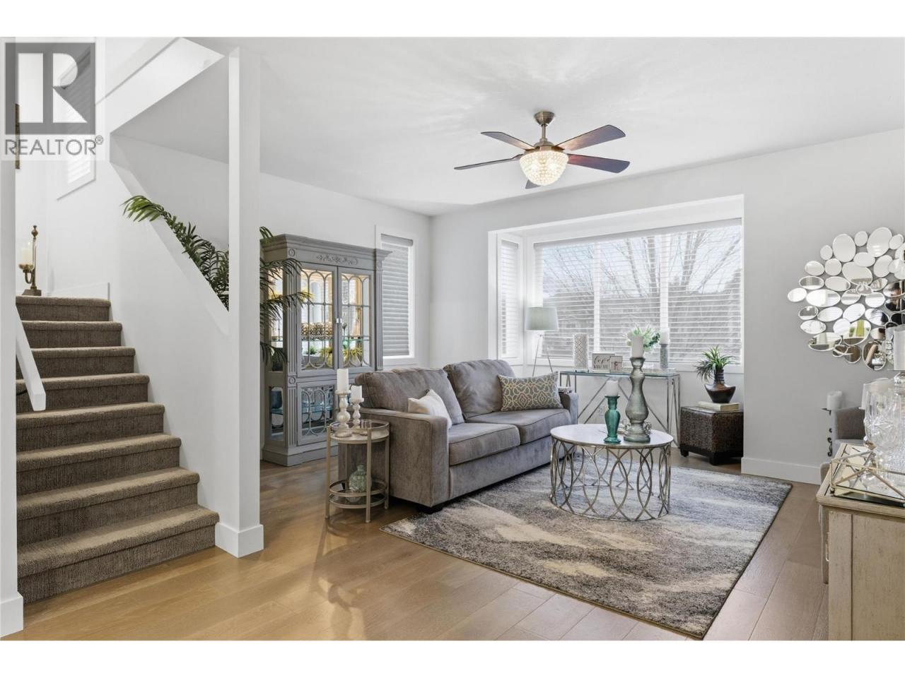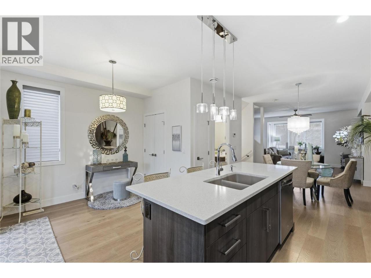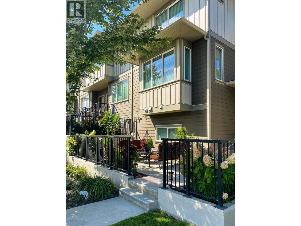 Bright and beautiful corner unit in the highly sought-after Grove development, offering modern lifestyle living in the heart of Glenmore. This like-new 3-bedroom, 4-bath townhome with a finished lower-level flex space is one of the largest units in the complex, blending comfort and style while being flooded with natural light throughout. High-end finishes include wide-plank engineered hardwood floors, high ceilings, and European-tiled bathrooms with luxurious fixtures. The open-concept main level showcases a chef’s kitchen with soft-close cabinetry, oversized island, quartz countertops, stainless steel appliances, and an electric fireplace in the living room. Two distinct outdoor living spaces enhance the home’s appeal: a covered deck off the kitchen—perfect for morning coffee—and a walk-up front patio ideal for entertaining. A heated double car garage and low strata fees add to the convenience. The finished lower-level flex space includes a full 4-piece bathroom and large walk-in closet, offering versatile options for guests, family, or work-from-home needs. Centrally located just steps to shopping, restaurants, Brandt’s Creek Linear Park, hiking trails, and the new Glenmore Recreation Park with skateboard park, pickleball courts, sports fields, and more. Close to Dr. Knox Middle School and three elementary schools. Don’t miss this opportunity for high-end, convenient Okanagan lifestyle living for the whole family. (id:6769)