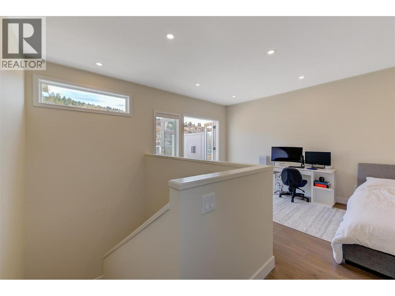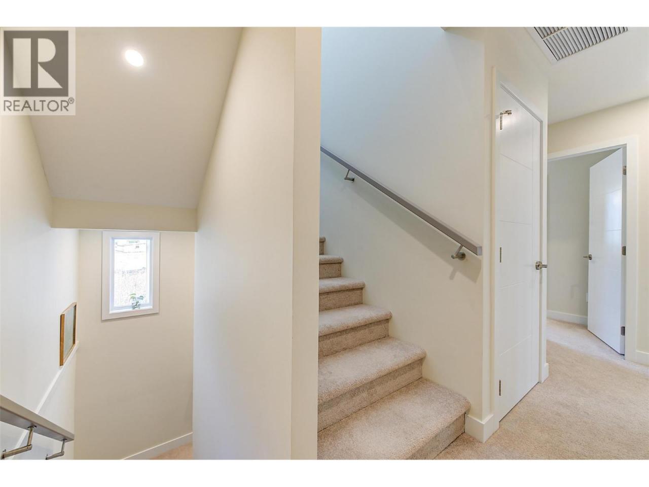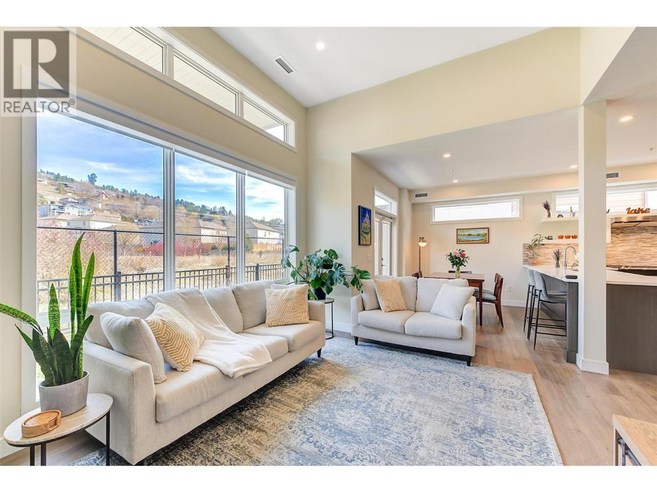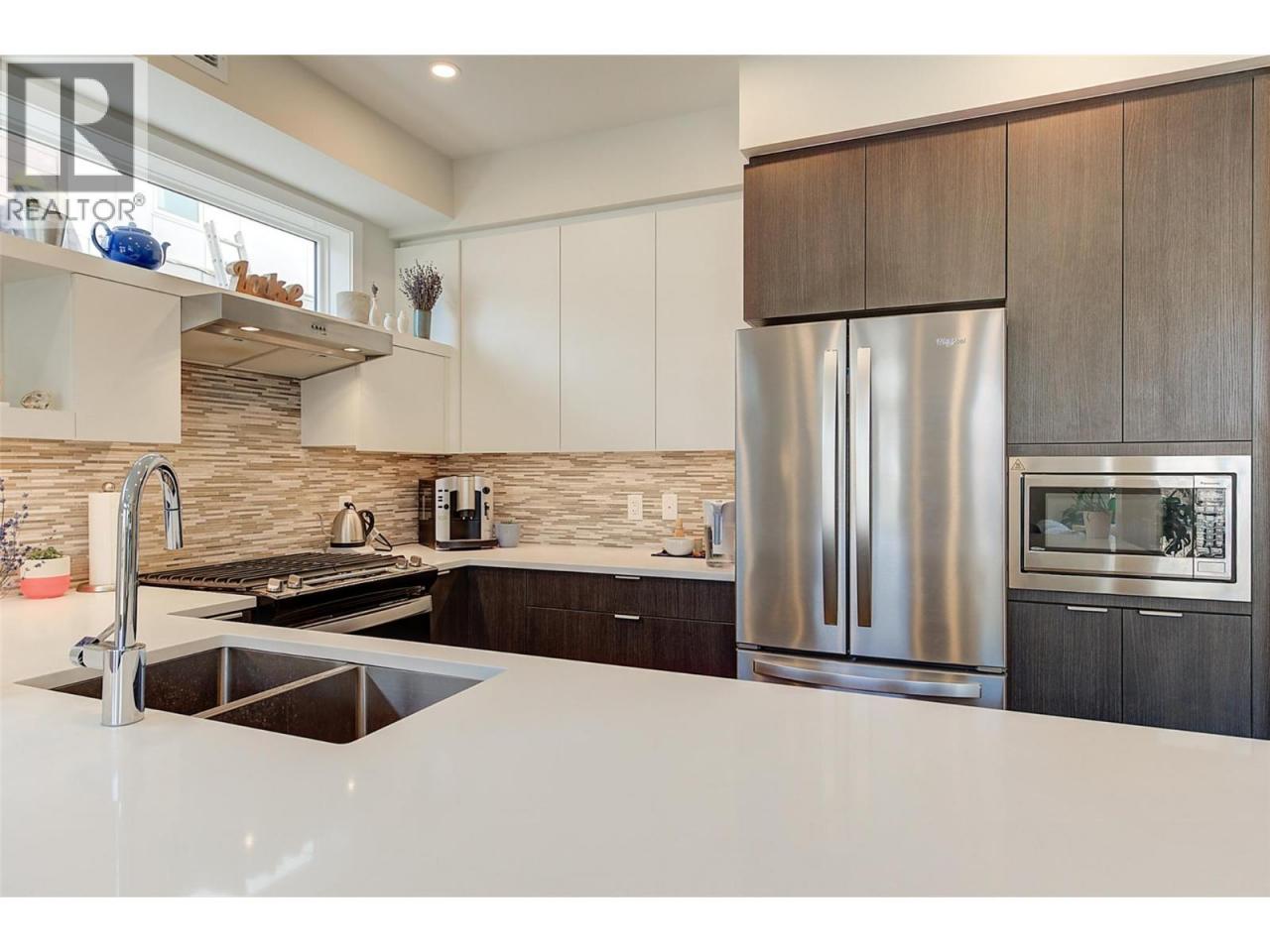 This stunning 2023 built corner unit in Lake Country offers premium living with the rare Swell B floor plan, designed with fewer stairs than most townhomes in the area, making daily living more convenient and accessible. Backing directly onto the Rail Trail, enjoy added privacy and easy access to outdoor recreation. The open concept main floor boasts a modern kitchen with two toned cabinetry, quartz countertops, quality stainless steel appliances including a gas stove, and a large peninsula island. The spacious living room features an upgraded fireplace and flows seamlessly to a large patio with a gas BBQ outlet. High ceilings and abundant natural light enhance the home’s inviting feel. Upstairs, the primary suite includes a large walk in closet and ensuite with dual vanities, beautiful tile work, and a glass shower. Two additional bedrooms, a full guest bath, and a spacious laundry room complete this floor. The upstairs loft offers versatility as a flex space, home office, gym, or potential fourth bedroom, with direct access to the private rooftop deck, ready for your hot tub. A ground level outdoor storage unit provides convenient space for bikes, tires, and seasonal decor. Additional features include central air, central vacuum for both the home and garage, a garden plot, and a fenced yard. Located across from tennis courts, parks, Wood Lake, and the dog beach, with UBCO and the airport just minutes away. NO GST! (id:6769)