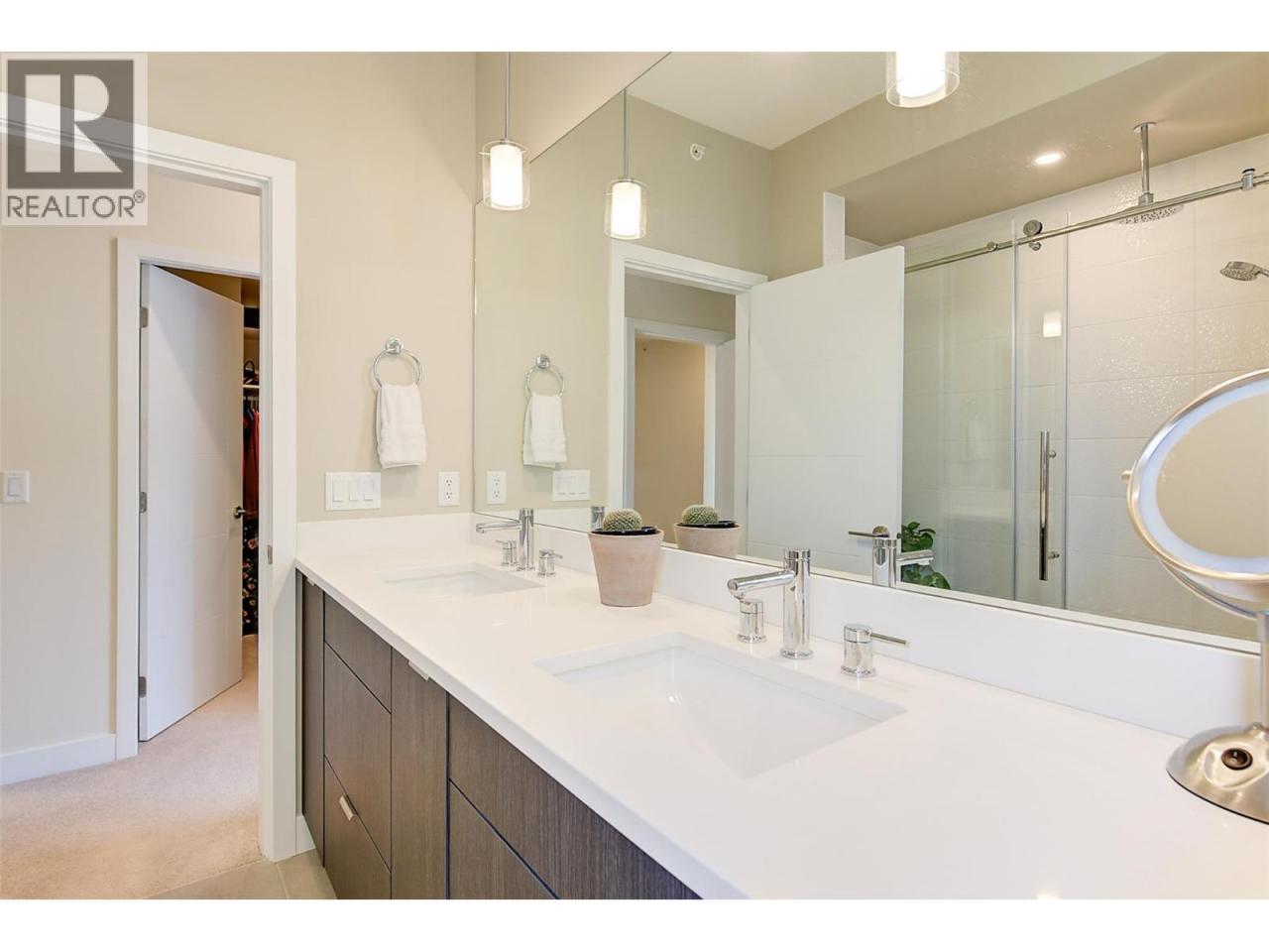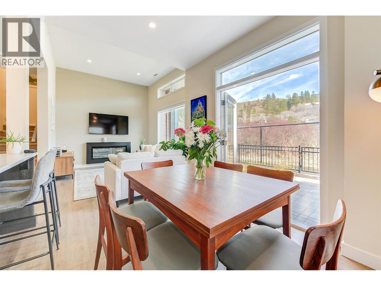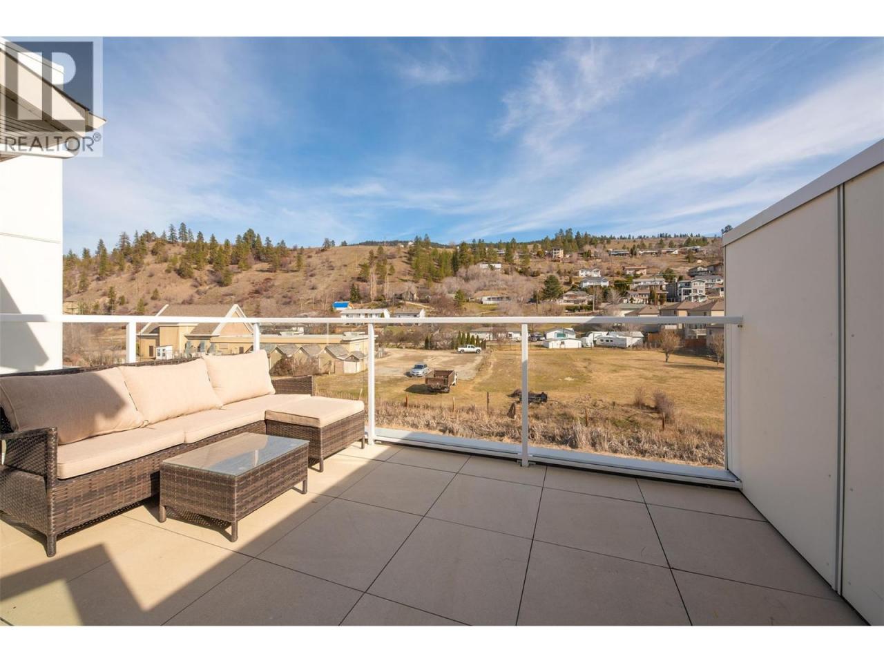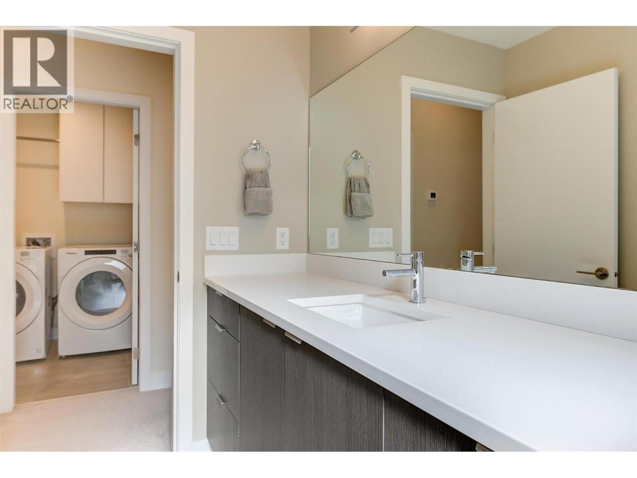 This stunning 2023 built corner unit in Lake Country offers premium living with the rare Swell B floor plan, designed with fewer stairs than most townhomes in the area, making daily living more convenient and accessible. Backing directly onto the Rail Trail, enjoy added privacy and easy access to outdoor recreation. The open concept main floor boasts a modern kitchen with two toned cabinetry, quartz countertops, quality stainless steel appliances including a gas stove, and a large peninsula island. The spacious living room features an upgraded fireplace and flows seamlessly to a large patio with a gas BBQ outlet. High ceilings and abundant natural light enhance the home’s inviting feel. Upstairs, the primary suite includes a large walk in closet and ensuite with dual vanities, beautiful tile work, and a glass shower. Two additional bedrooms, a full guest bath, and a spacious laundry room complete this floor. The upstairs loft offers versatility as a flex space, home office, gym, or potential fourth bedroom, with direct access to the private rooftop deck, ready for your hot tub. A ground level outdoor storage unit provides convenient space for bikes, tires, and seasonal decor. Additional features include central air, central vacuum for both the home and garage, a garden plot, and a fenced yard. Located across from tennis courts, parks, Wood Lake, and the dog beach, with UBCO and the airport just minutes away. NO GST! (id:6769)