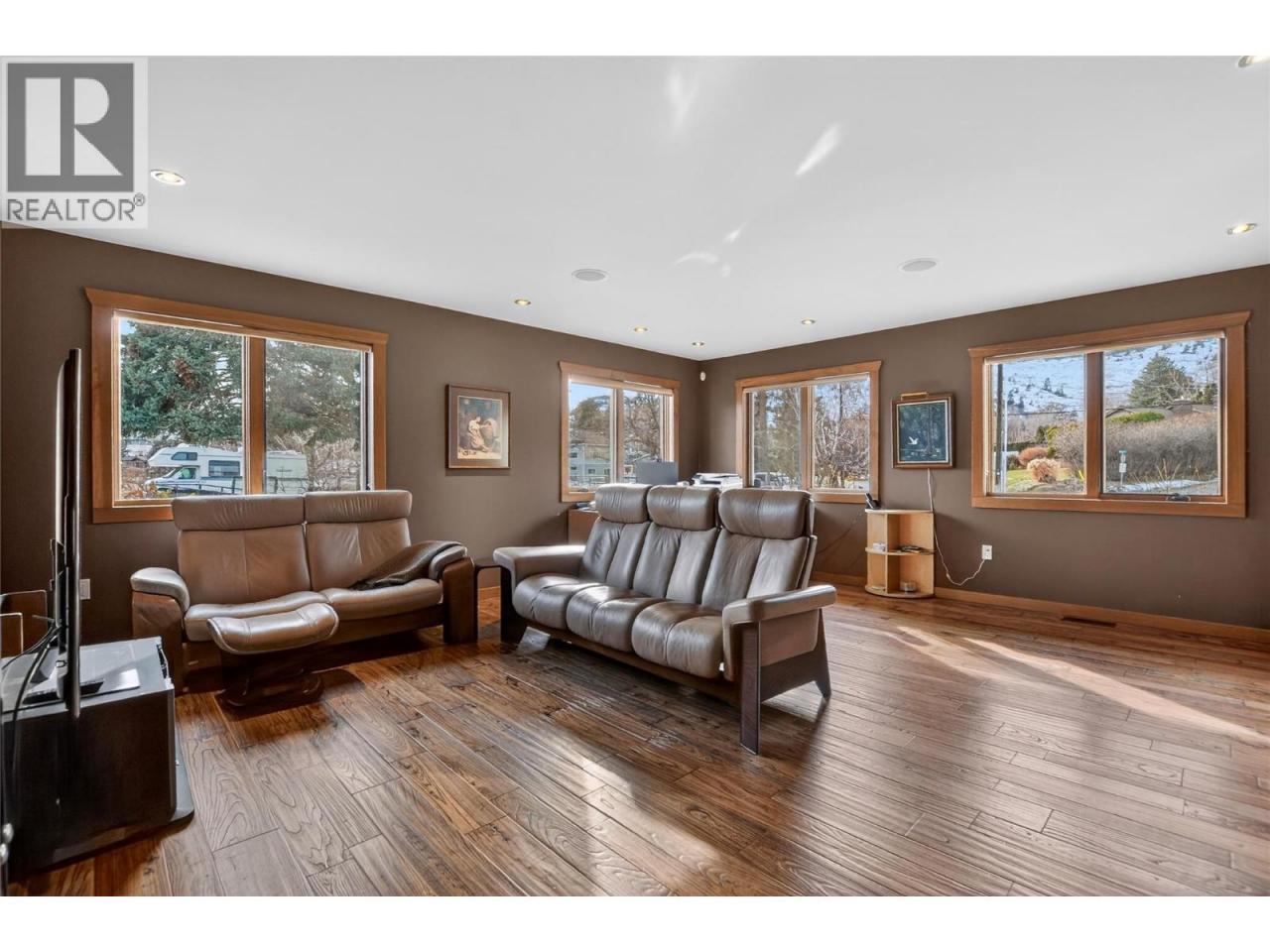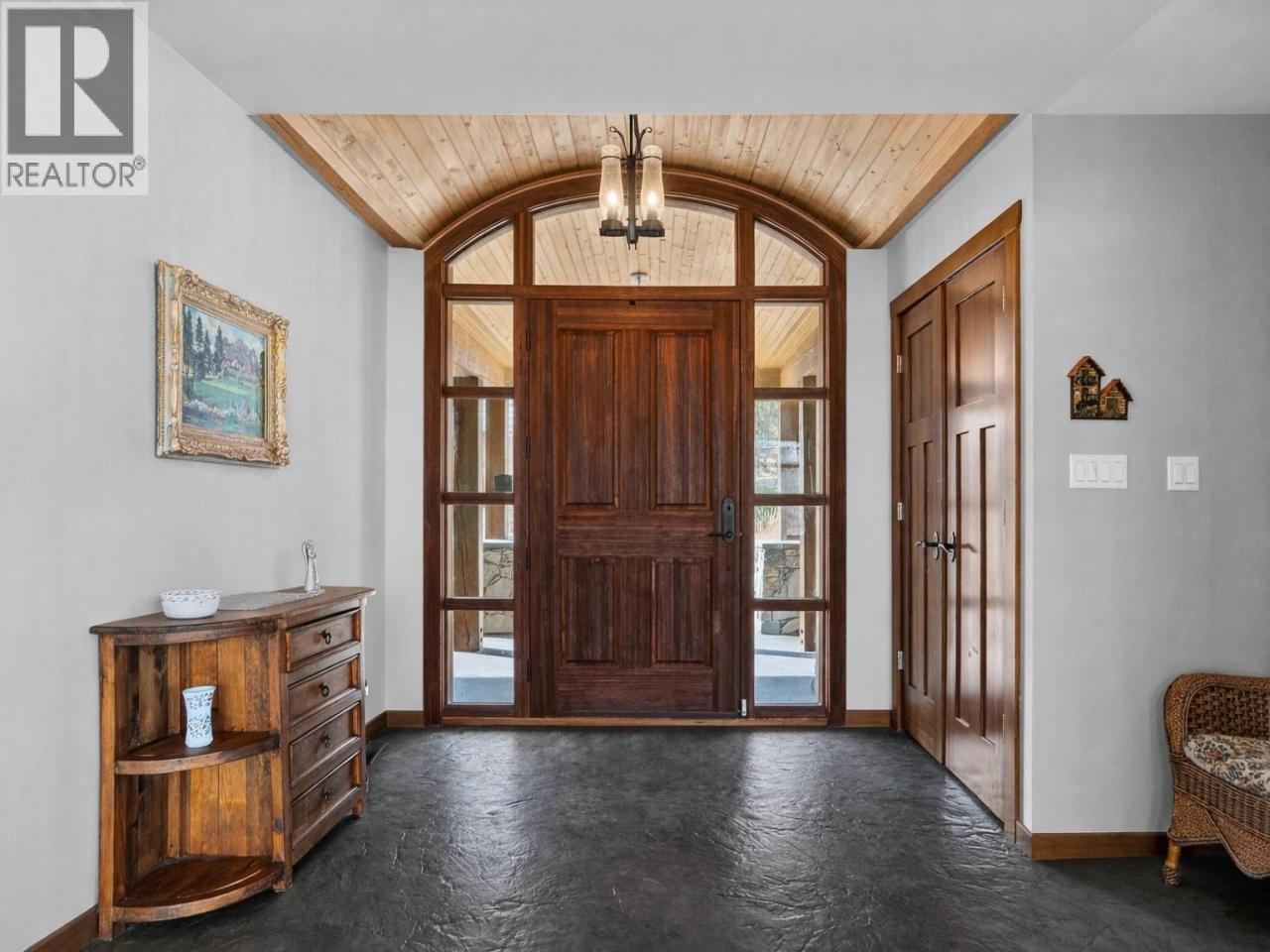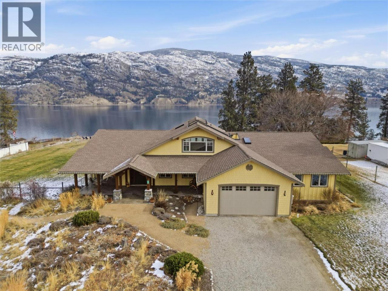 Set above Skaha Lake in Kaleden, next to the KVR Trail, this custom home is one of those properties people slow down to admire. It offers 7,000 sqft of living space w/ 5 baths, 4 bedrms plus an additional 2 bedrms set up in the flex room on the main floor & the loft. With almost 2.5 acres, it has space to add features like a pool & a pool house. The covered front porch w/ its barrel-style ceiling flows right into the foyer. In the great room, the timber mantle & stone fireplace anchor the space, while the fir trim throughout adds elegance & shows that no expense was spared in building this home. The kitchen w/ a massive granite-topped island, Miele appliances, banquette seating, & direct access to the concrete stamped deck w/ glass railing for unobstructed views of nature. The primary suite is a retreat with french doors to a private sitting area, a two-way fireplace, and renovated ensuite with a soaker tub. The loft is the perfect space for a bedroom or home office/art studio. The lower lvl adds a full kitchen, media room, games area, 3 bedrms & storage. Excellent opportunity for a short-term rental set up. The detached 4-bay garage is a dream for hobbies, cars or toys. ICF construction, geo-thermal, stamped concrete with radiant floor on all 3 lvls. Step-free access on the main floor, wider interior hallways, and direct access to the backyard path, which leads to a magical viewpoint, add comfort and flexibility for new homeowners to age in place. (id:6769)
