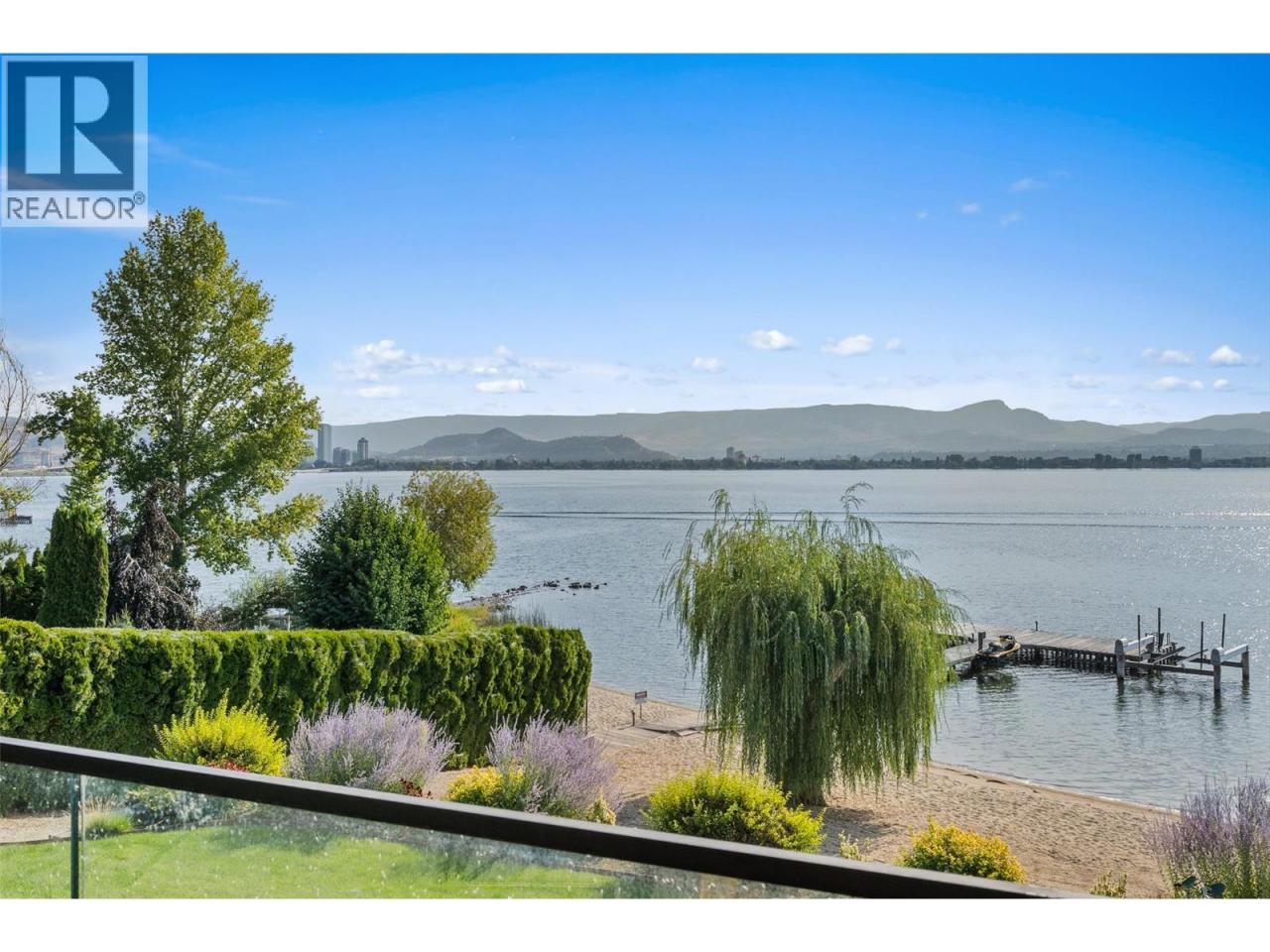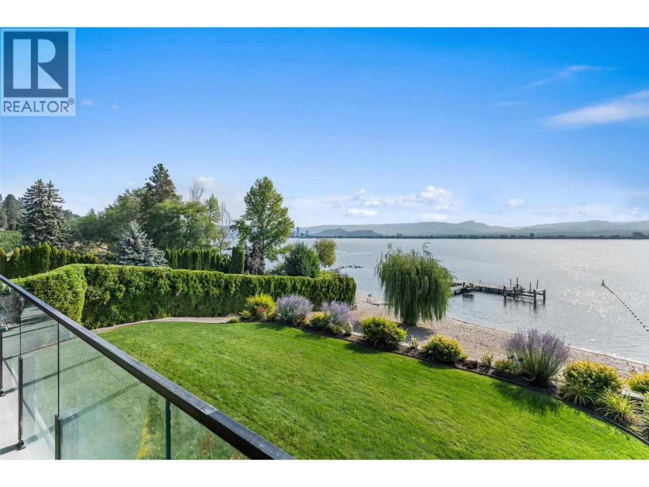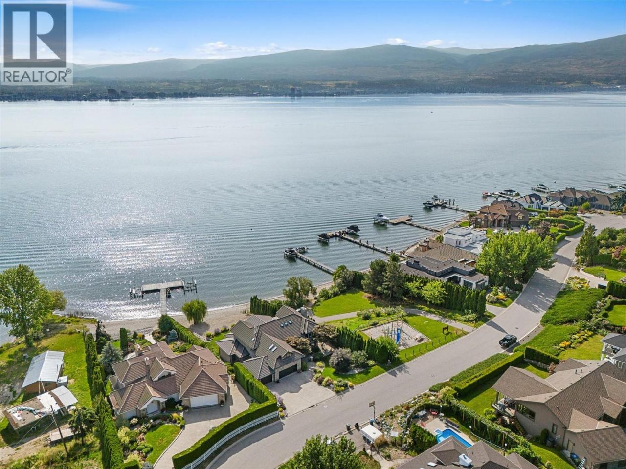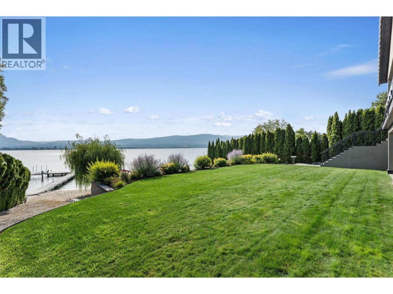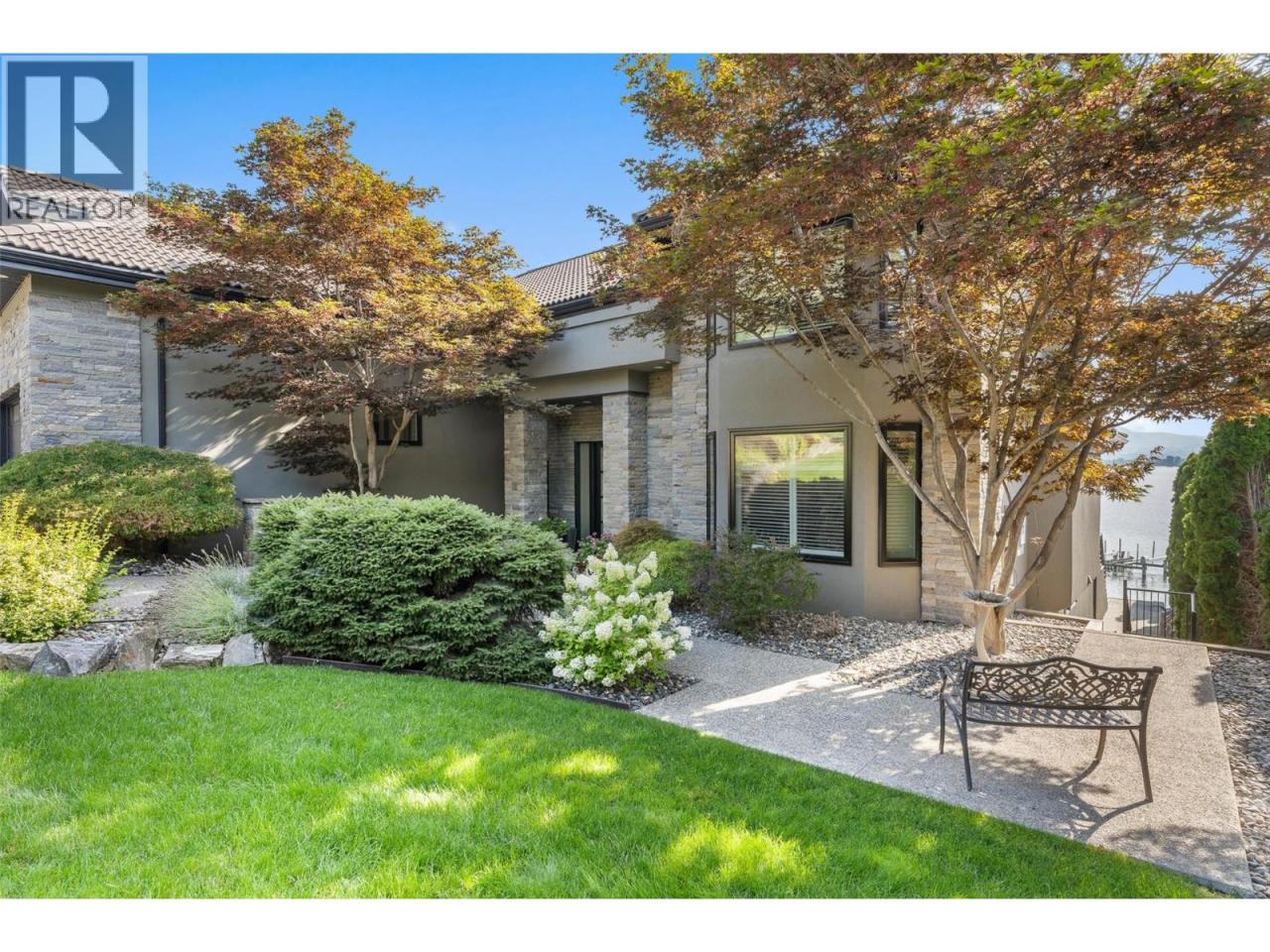 Nestled on a quiet cul de sac in a private waterfront setting, this beautiful customized residence offers a rare opportunity to experience tranquil living on the shores of Okanagan Lake. Surrounded by mature gently sloping grounds, the home blends refined design with a relaxed, resort-inspired lifestyle. Panoramic city and lake view and just minutes into town! A grand foyer with soaring ceilings, skylights and a graceful curved staircase welcomes you inside. The main living area unfolds beneath expansive windows and wall-to-wall Nano doors that open to the covered lakeside deck, creating seamless indoor-outdoor living just steps from the water. At the heart of the home, the chef’s kitchen featuring two islands, including a large L-shaped island with seating for seven, stone countertops, premium Thermador appliances and an oversized walk-in pantry. The primary retreat offers deck access, a custom walk-in closet and a spa-inspired ensuite with heated floors, a freestanding soaker tub and a fully tiled walk-in shower. Additional bedrooms on the upper level provide privacy for family and guests, including a second primary-style suite. The lower level is designed for relaxation with a spacious rec room, temp-controlled wine room, guest suite and walk-out access to the covered patio and backyard. All levels with elevator access! Outside, tiered landscaping leads to a sandy beach and a dock with boat and Seadoo lifts. Heated triple garage and generous driveway parking. (id:6769)