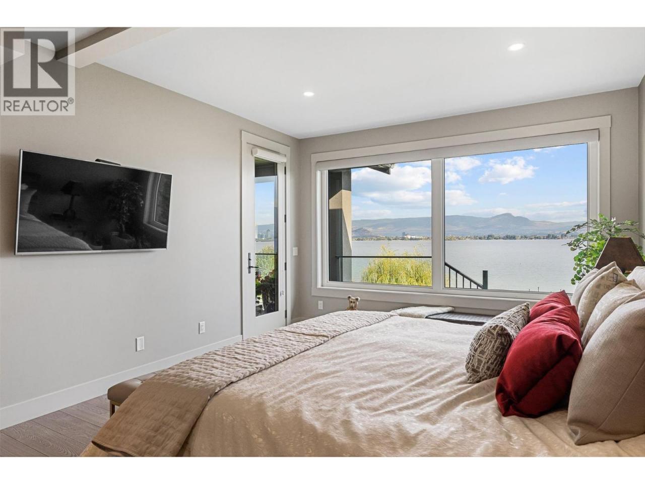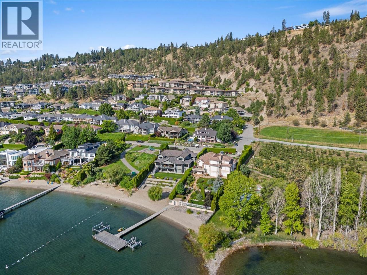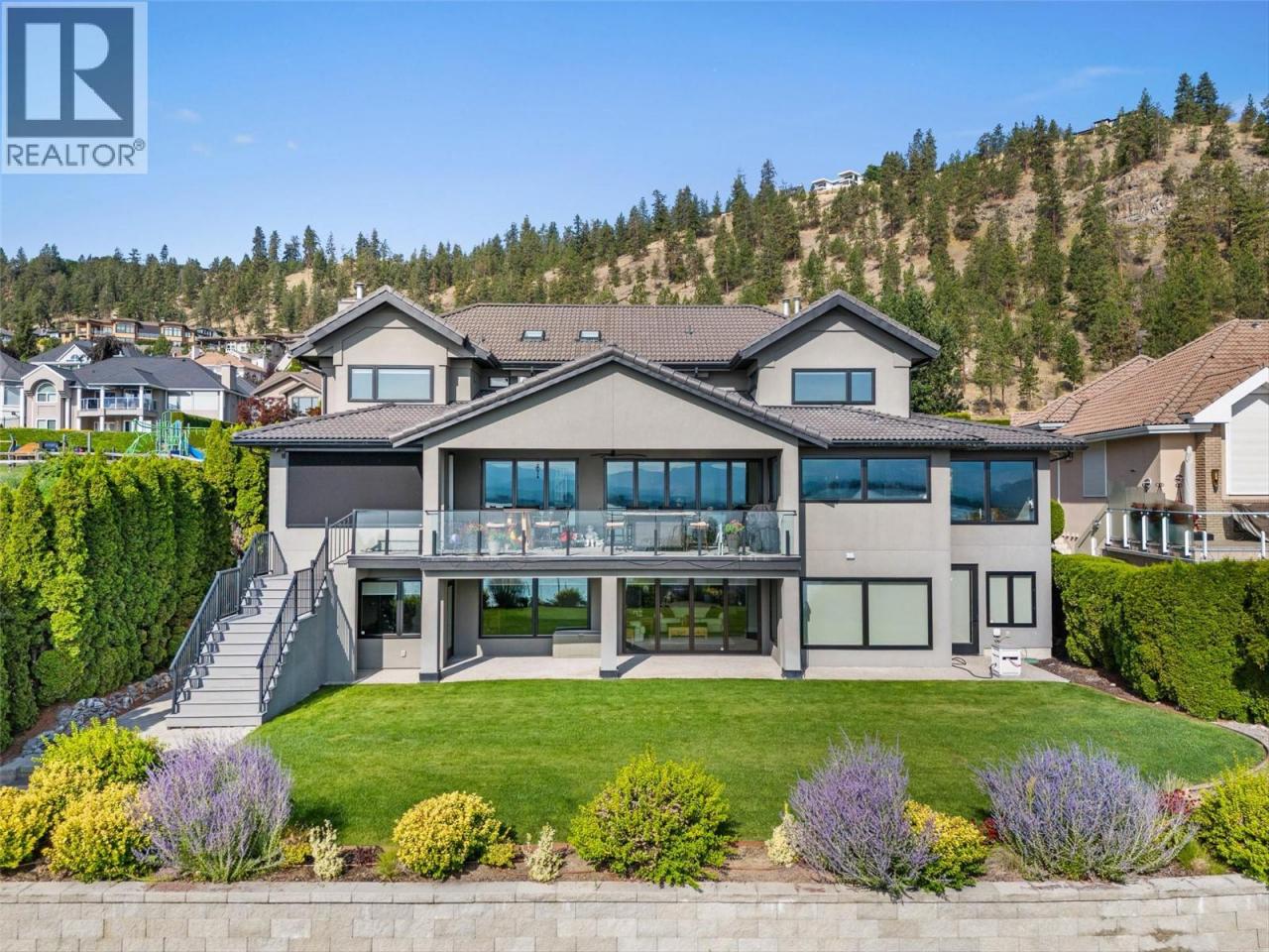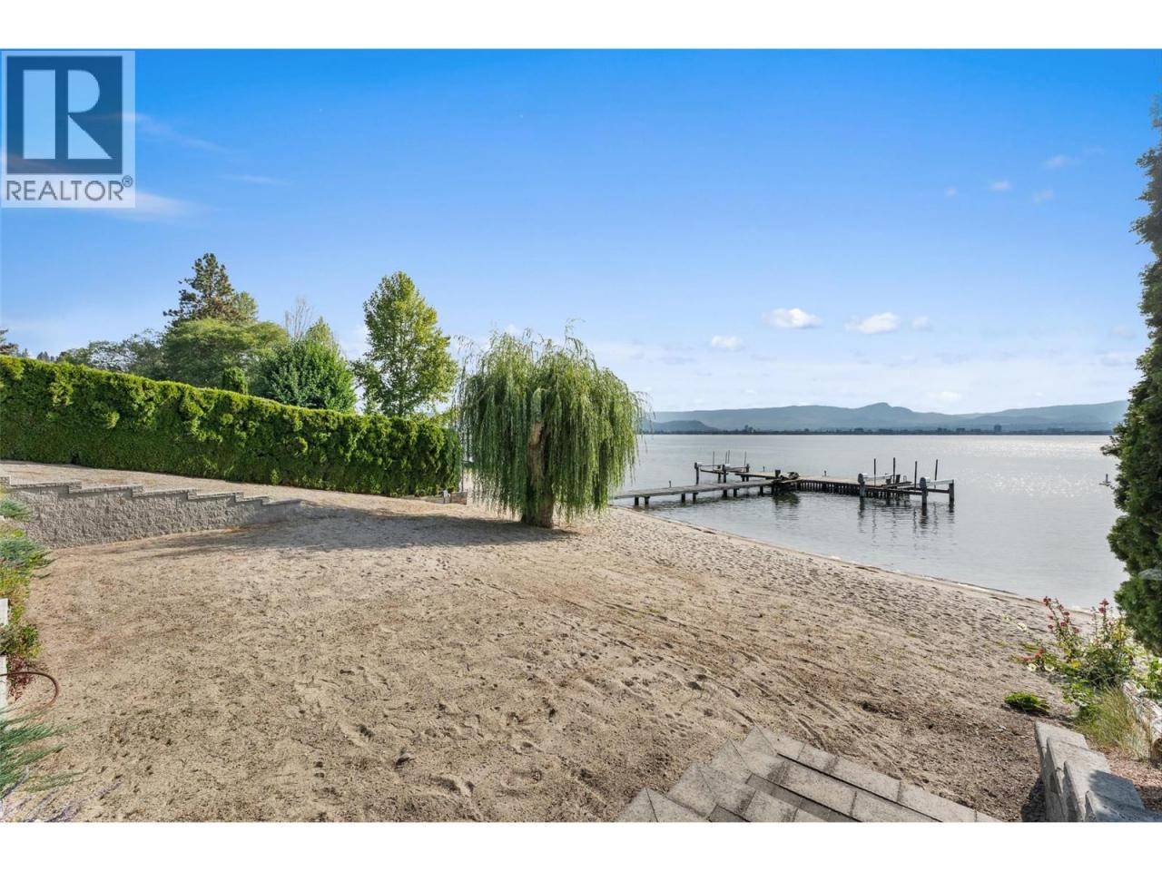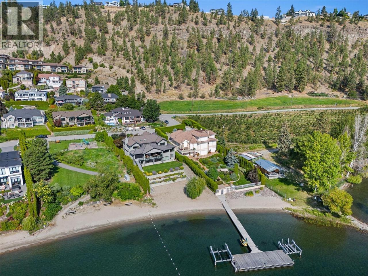 Nestled on a quiet cul de sac in a private waterfront setting, this beautiful customized residence offers a rare opportunity to experience tranquil living on the shores of Okanagan Lake. Surrounded by mature gently sloping grounds, the home blends refined design with a relaxed, resort-inspired lifestyle. Panoramic city and lake view and just minutes into town! A grand foyer with soaring ceilings, skylights and a graceful curved staircase welcomes you inside. The main living area unfolds beneath expansive windows and wall-to-wall Nano doors that open to the covered lakeside deck, creating seamless indoor-outdoor living just steps from the water. At the heart of the home, the chef’s kitchen featuring two islands, including a large L-shaped island with seating for seven, stone countertops, premium Thermador appliances and an oversized walk-in pantry. The primary retreat offers deck access, a custom walk-in closet and a spa-inspired ensuite with heated floors, a freestanding soaker tub and a fully tiled walk-in shower. Additional bedrooms on the upper level provide privacy for family and guests, including a second primary-style suite. The lower level is designed for relaxation with a spacious rec room, temp-controlled wine room, guest suite and walk-out access to the covered patio and backyard. All levels with elevator access! Outside, tiered landscaping leads to a sandy beach and a dock with boat and Seadoo lifts. Heated triple garage and generous driveway parking. (id:6769)
