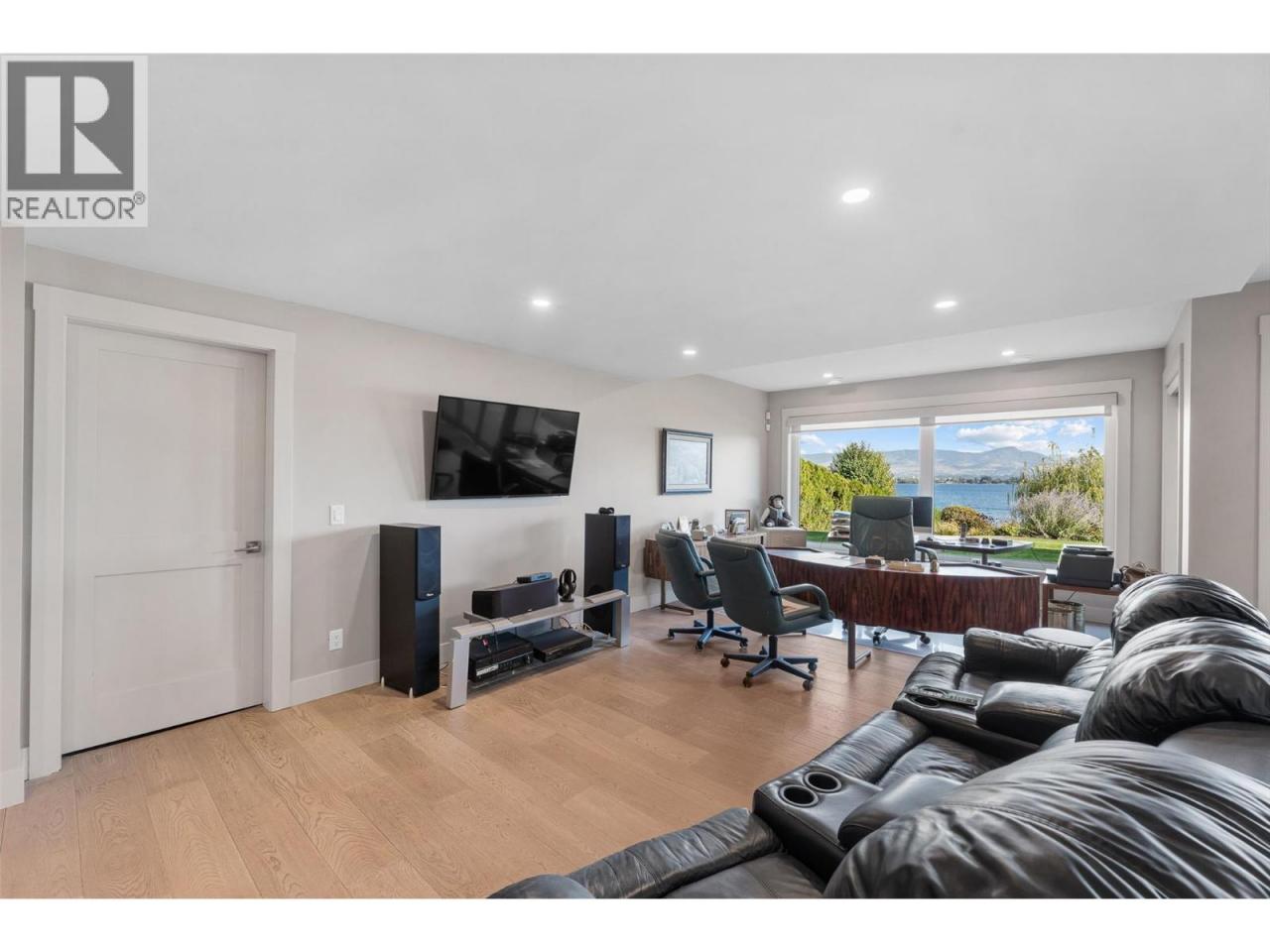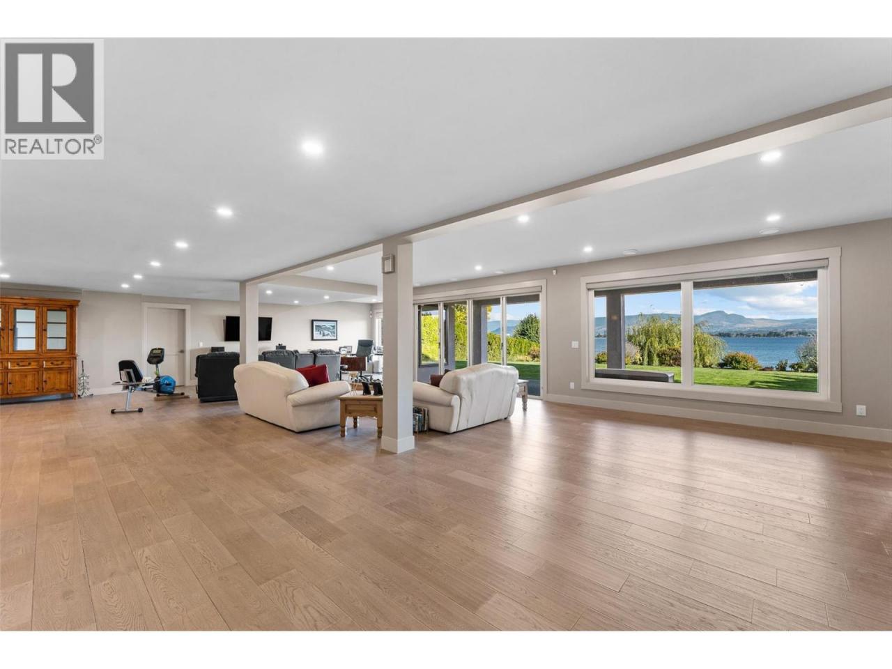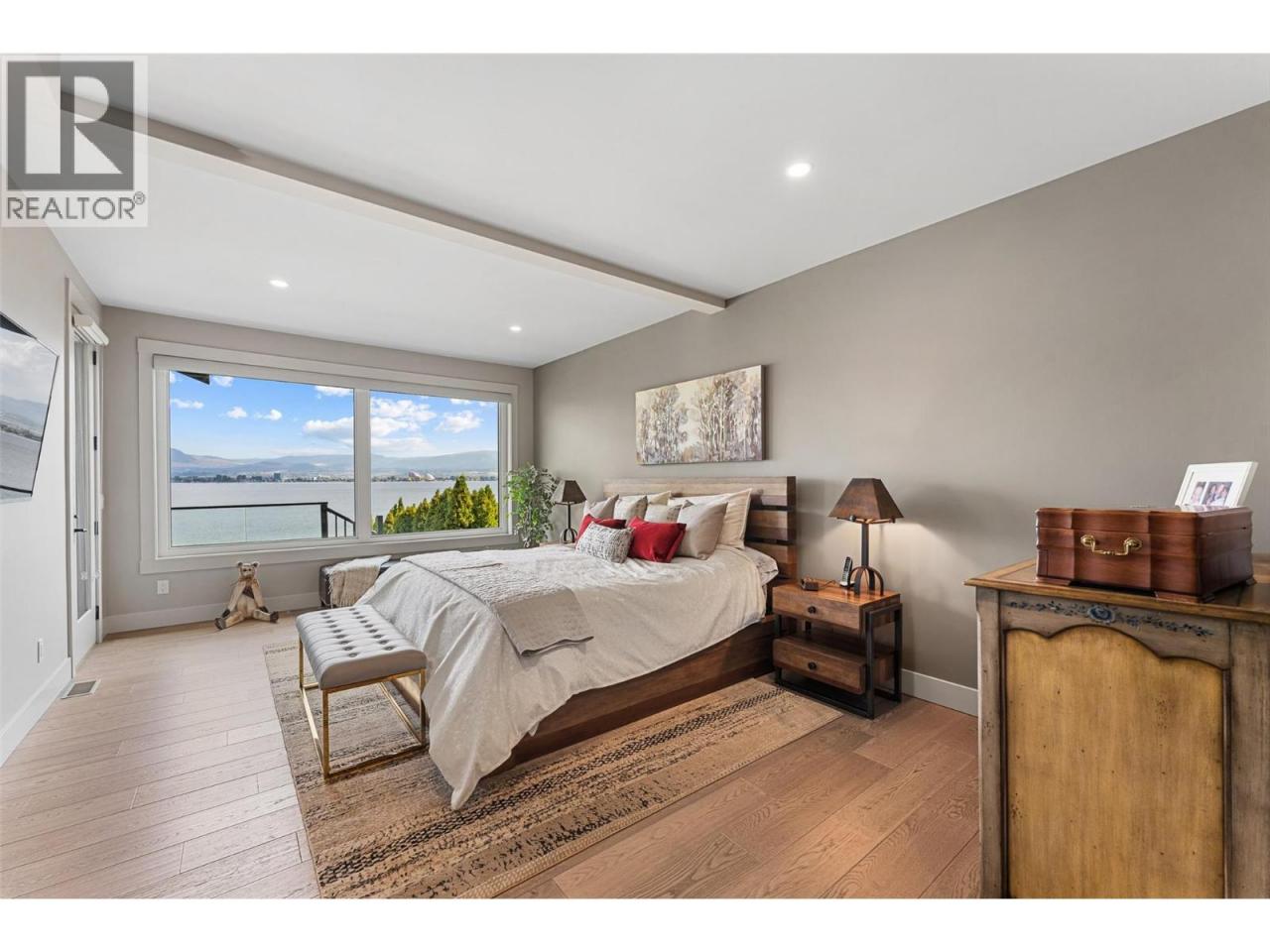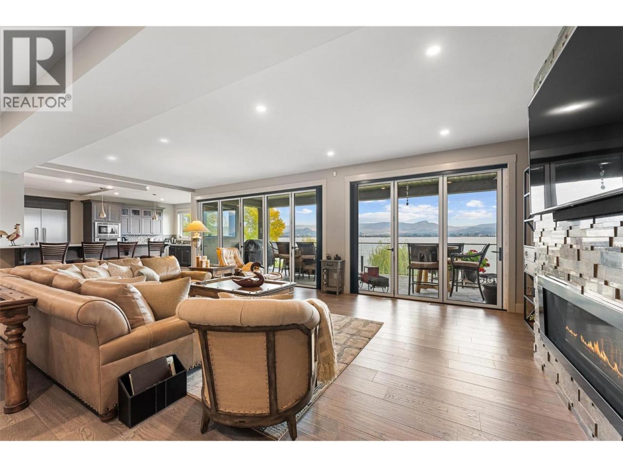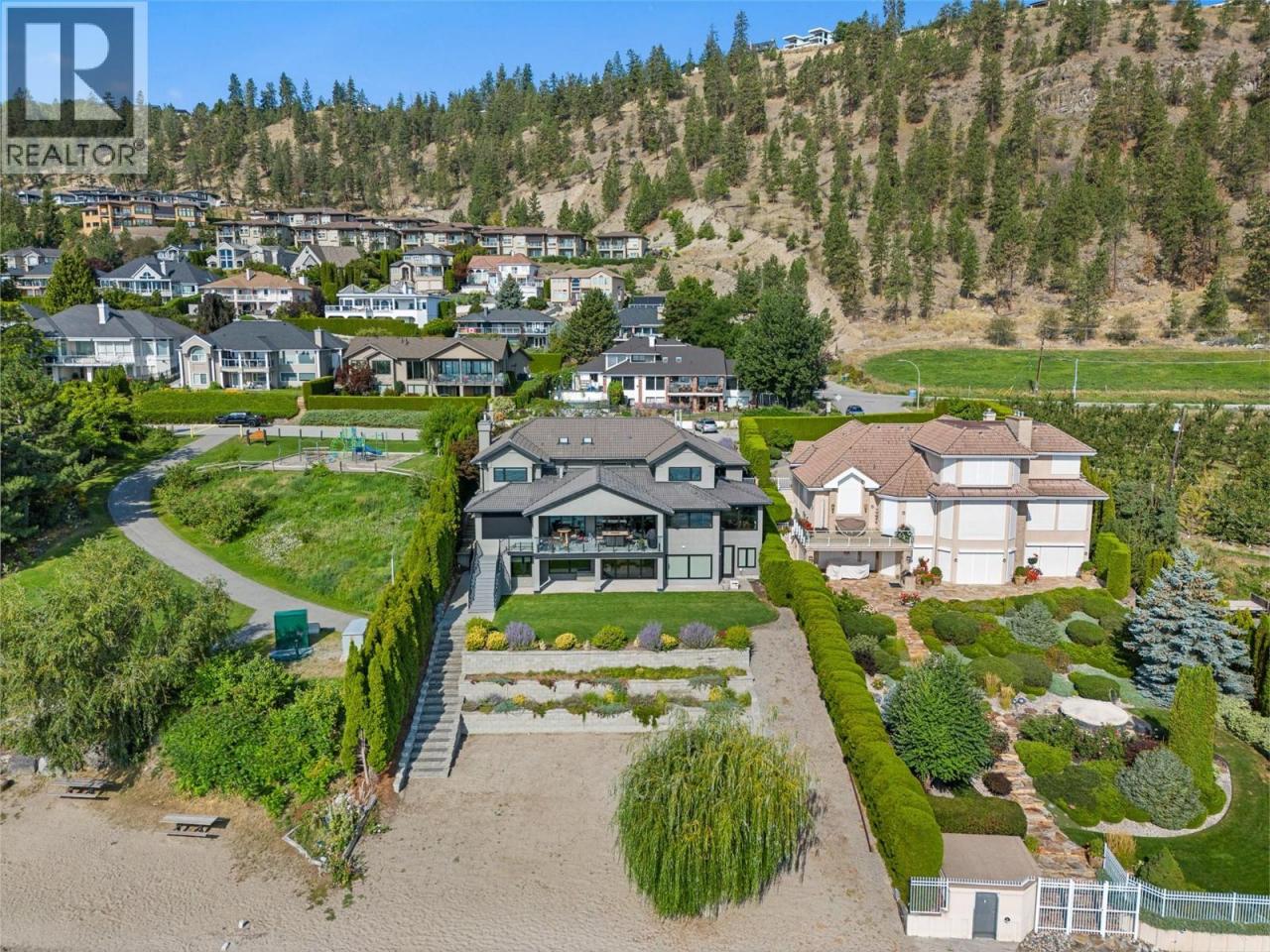 Nestled on a quiet cul de sac in a private waterfront setting, this beautiful customized residence offers a rare opportunity to experience tranquil living on the shores of Okanagan Lake. Surrounded by mature gently sloping grounds, the home blends refined design with a relaxed, resort-inspired lifestyle. Panoramic city and lake view and just minutes into town! A grand foyer with soaring ceilings, skylights and a graceful curved staircase welcomes you inside. The main living area unfolds beneath expansive windows and wall-to-wall Nano doors that open to the covered lakeside deck, creating seamless indoor-outdoor living just steps from the water. At the heart of the home, the chef’s kitchen featuring two islands, including a large L-shaped island with seating for seven, stone countertops, premium Thermador appliances and an oversized walk-in pantry. The primary retreat offers deck access, a custom walk-in closet and a spa-inspired ensuite with heated floors, a freestanding soaker tub and a fully tiled walk-in shower. Additional bedrooms on the upper level provide privacy for family and guests, including a second primary-style suite. The lower level is designed for relaxation with a spacious rec room, temp-controlled wine room, guest suite and walk-out access to the covered patio and backyard. All levels with elevator access! Outside, tiered landscaping leads to a sandy beach and a dock with boat and Seadoo lifts. Heated triple garage and generous driveway parking. (id:6769)