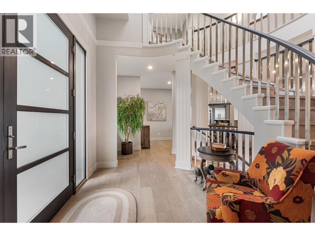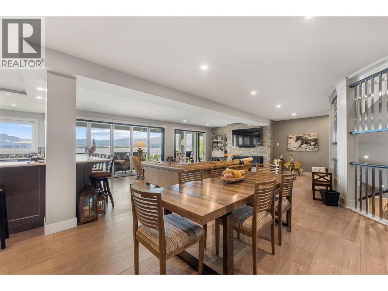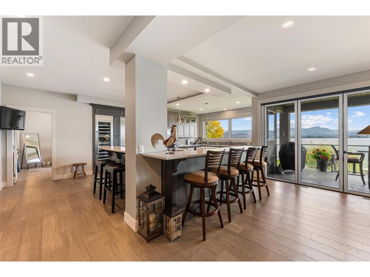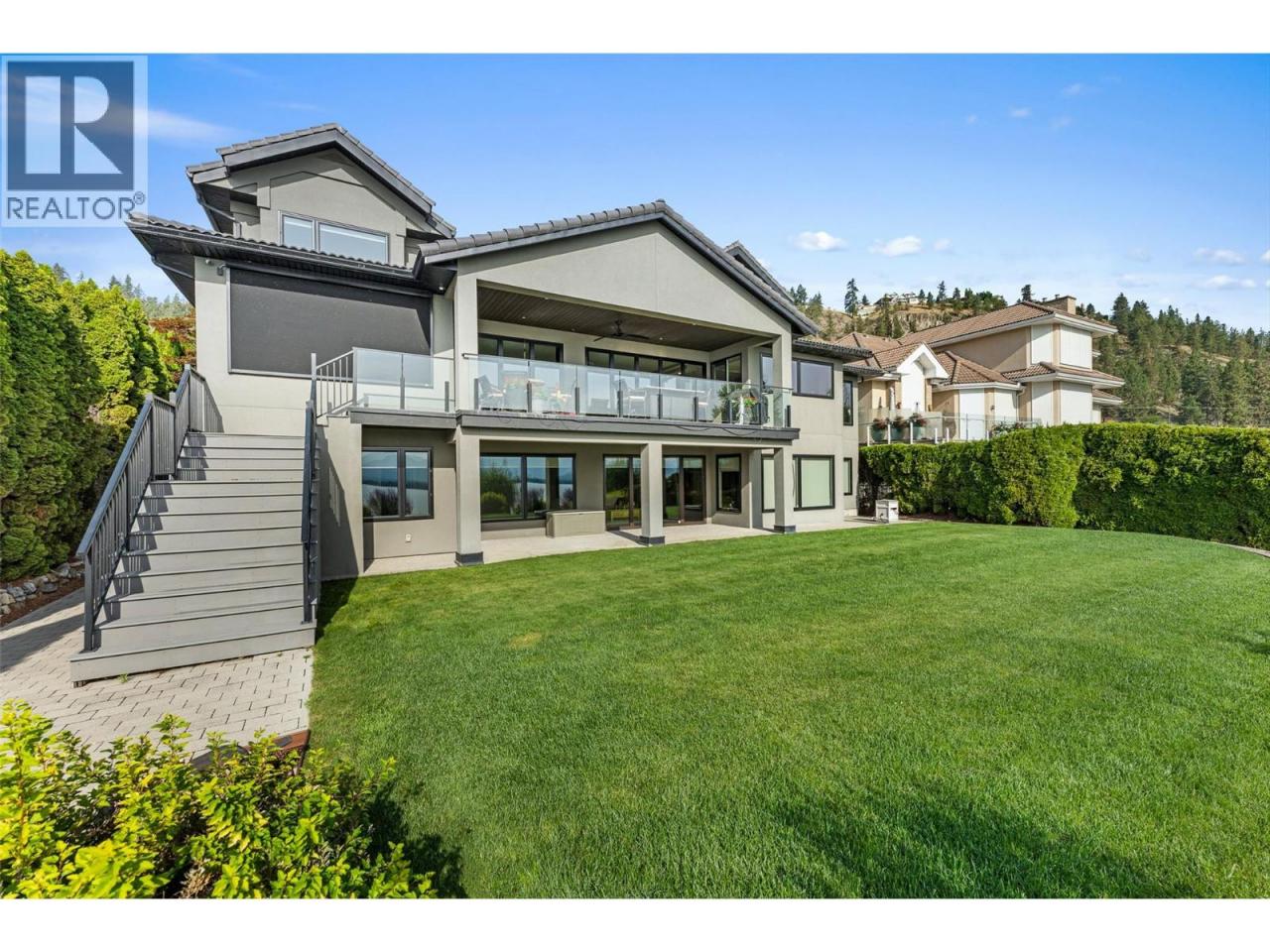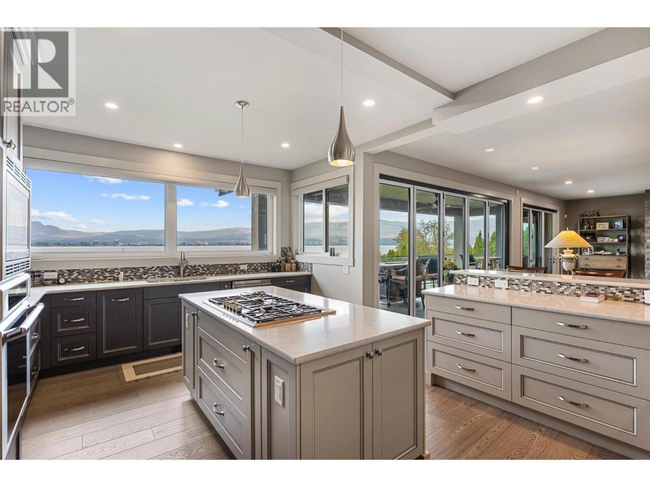 Nestled on a quiet cul de sac in a private waterfront setting, this beautiful customized residence offers a rare opportunity to experience tranquil living on the shores of Okanagan Lake. Surrounded by mature gently sloping grounds, the home blends refined design with a relaxed, resort-inspired lifestyle. Panoramic city and lake view and just minutes into town! A grand foyer with soaring ceilings, skylights and a graceful curved staircase welcomes you inside. The main living area unfolds beneath expansive windows and wall-to-wall Nano doors that open to the covered lakeside deck, creating seamless indoor-outdoor living just steps from the water. At the heart of the home, the chef’s kitchen featuring two islands, including a large L-shaped island with seating for seven, stone countertops, premium Thermador appliances and an oversized walk-in pantry. The primary retreat offers deck access, a custom walk-in closet and a spa-inspired ensuite with heated floors, a freestanding soaker tub and a fully tiled walk-in shower. Additional bedrooms on the upper level provide privacy for family and guests, including a second primary-style suite. The lower level is designed for relaxation with a spacious rec room, temp-controlled wine room, guest suite and walk-out access to the covered patio and backyard. All levels with elevator access! Outside, tiered landscaping leads to a sandy beach and a dock with boat and Seadoo lifts. Heated triple garage and generous driveway parking. (id:6769)
