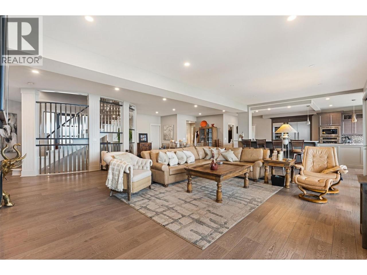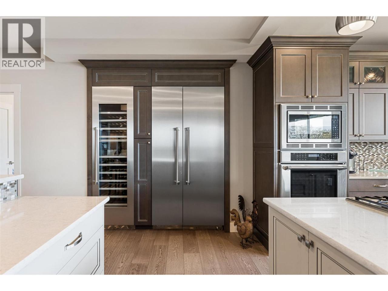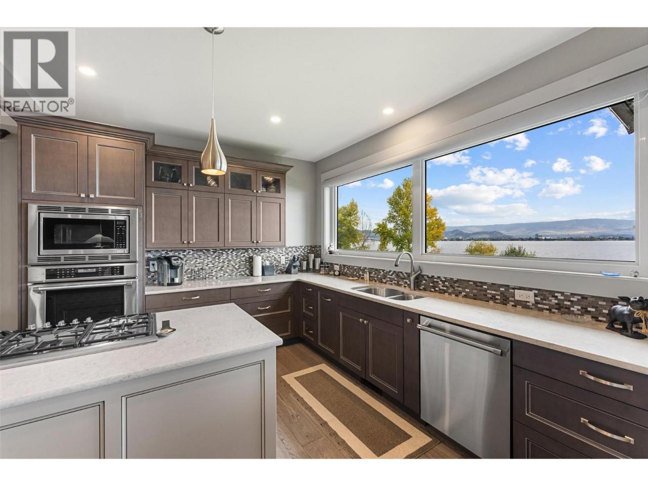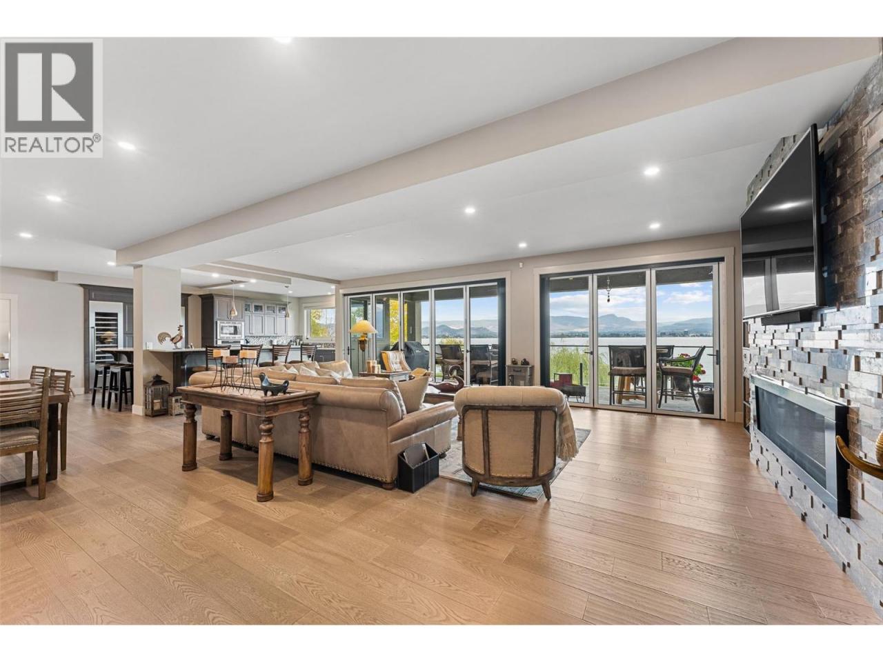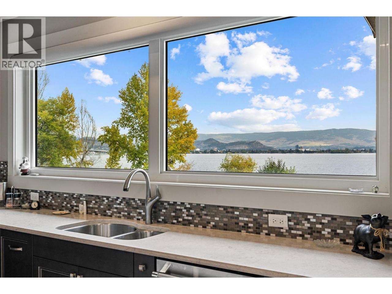 Nestled on a quiet cul de sac in a private waterfront setting, this beautiful customized residence offers a rare opportunity to experience tranquil living on the shores of Okanagan Lake. Surrounded by mature gently sloping grounds, the home blends refined design with a relaxed, resort-inspired lifestyle. Panoramic city and lake view and just minutes into town! A grand foyer with soaring ceilings, skylights and a graceful curved staircase welcomes you inside. The main living area unfolds beneath expansive windows and wall-to-wall Nano doors that open to the covered lakeside deck, creating seamless indoor-outdoor living just steps from the water. At the heart of the home, the chef’s kitchen featuring two islands, including a large L-shaped island with seating for seven, stone countertops, premium Thermador appliances and an oversized walk-in pantry. The primary retreat offers deck access, a custom walk-in closet and a spa-inspired ensuite with heated floors, a freestanding soaker tub and a fully tiled walk-in shower. Additional bedrooms on the upper level provide privacy for family and guests, including a second primary-style suite. The lower level is designed for relaxation with a spacious rec room, temp-controlled wine room, guest suite and walk-out access to the covered patio and backyard. All levels with elevator access! Outside, tiered landscaping leads to a sandy beach and a dock with boat and Seadoo lifts. Heated triple garage and generous driveway parking. (id:6769)