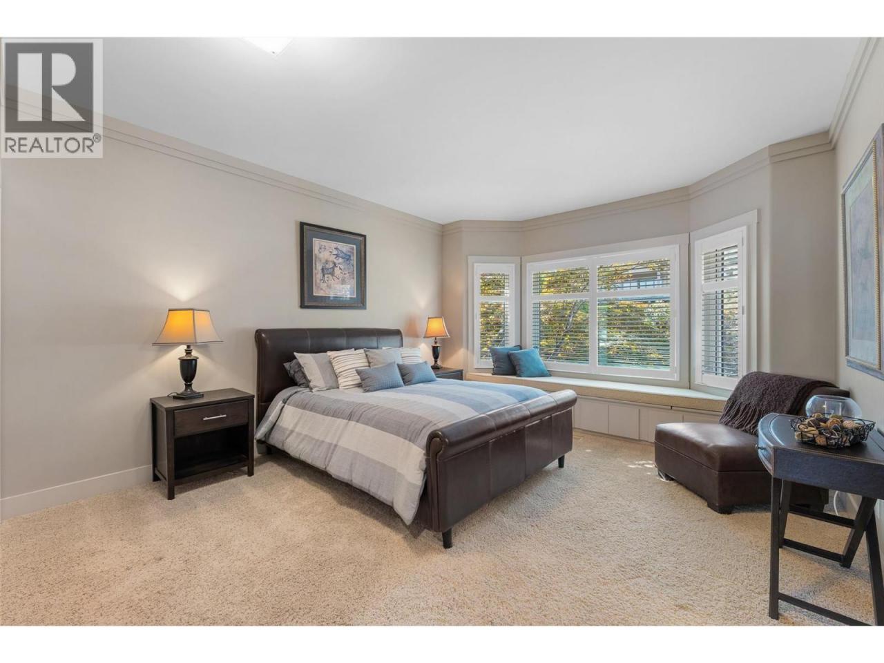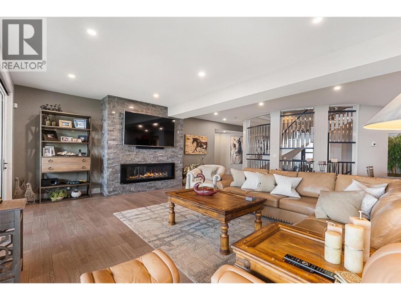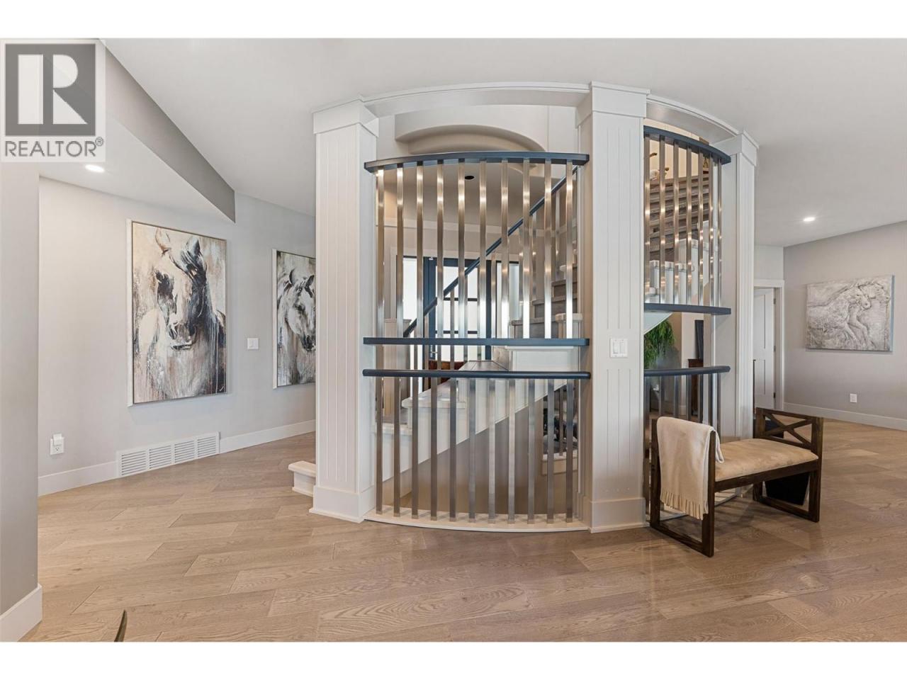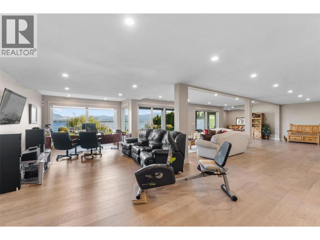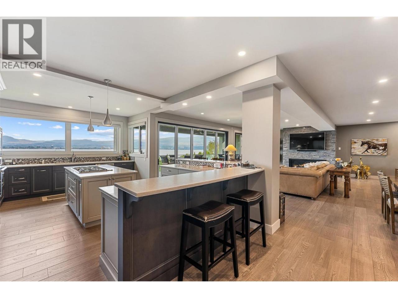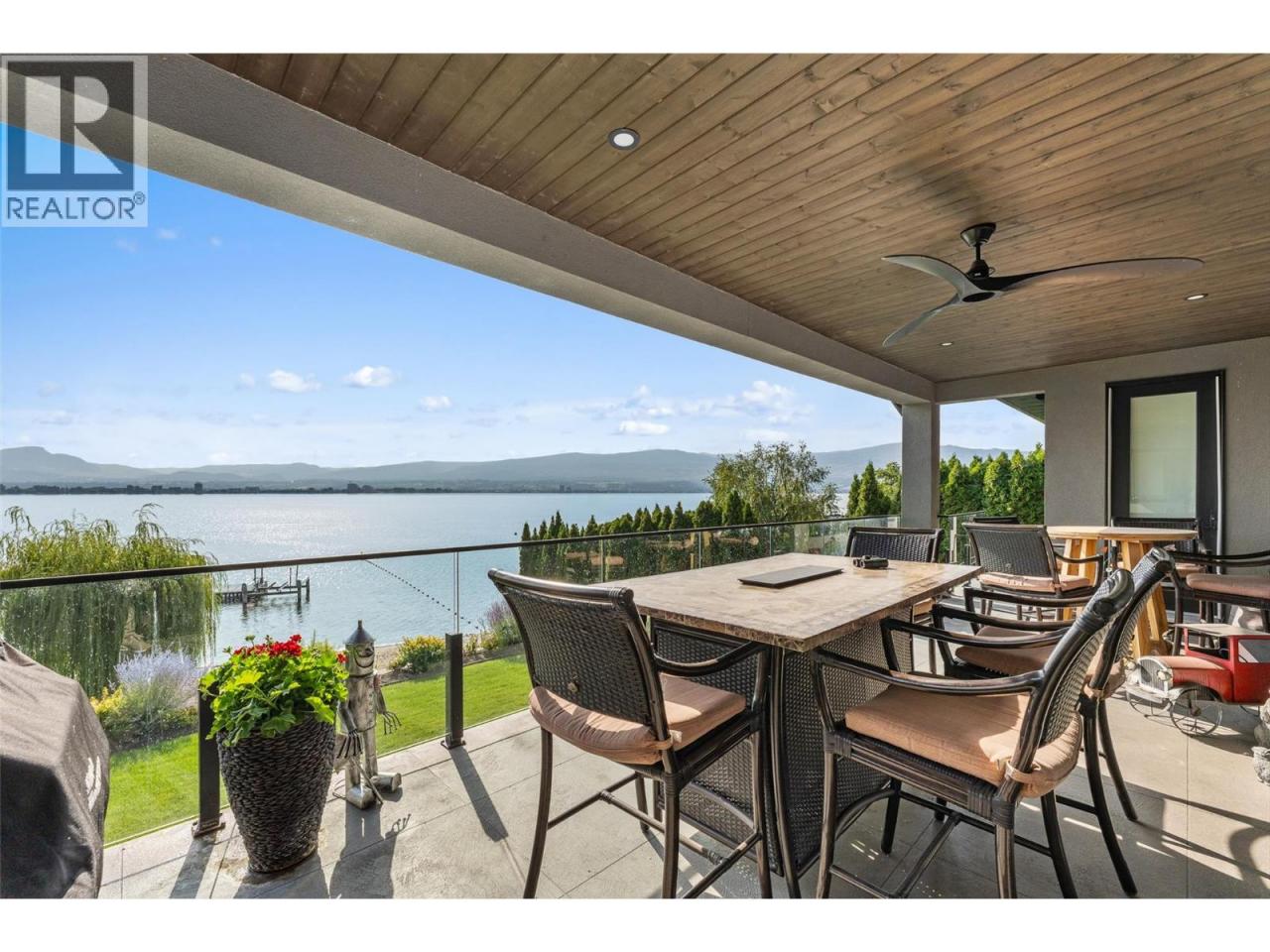 Nestled on a quiet cul de sac in a private waterfront setting, this beautiful customized residence offers a rare opportunity to experience tranquil living on the shores of Okanagan Lake. Surrounded by mature gently sloping grounds, the home blends refined design with a relaxed, resort-inspired lifestyle. Panoramic city and lake view and just minutes into town! A grand foyer with soaring ceilings, skylights and a graceful curved staircase welcomes you inside. The main living area unfolds beneath expansive windows and wall-to-wall Nano doors that open to the covered lakeside deck, creating seamless indoor-outdoor living just steps from the water. At the heart of the home, the chef’s kitchen featuring two islands, including a large L-shaped island with seating for seven, stone countertops, premium Thermador appliances and an oversized walk-in pantry. The primary retreat offers deck access, a custom walk-in closet and a spa-inspired ensuite with heated floors, a freestanding soaker tub and a fully tiled walk-in shower. Additional bedrooms on the upper level provide privacy for family and guests, including a second primary-style suite. The lower level is designed for relaxation with a spacious rec room, temp-controlled wine room, guest suite and walk-out access to the covered patio and backyard. All levels with elevator access! Outside, tiered landscaping leads to a sandy beach and a dock with boat and Seadoo lifts. Heated triple garage and generous driveway parking. (id:6769)