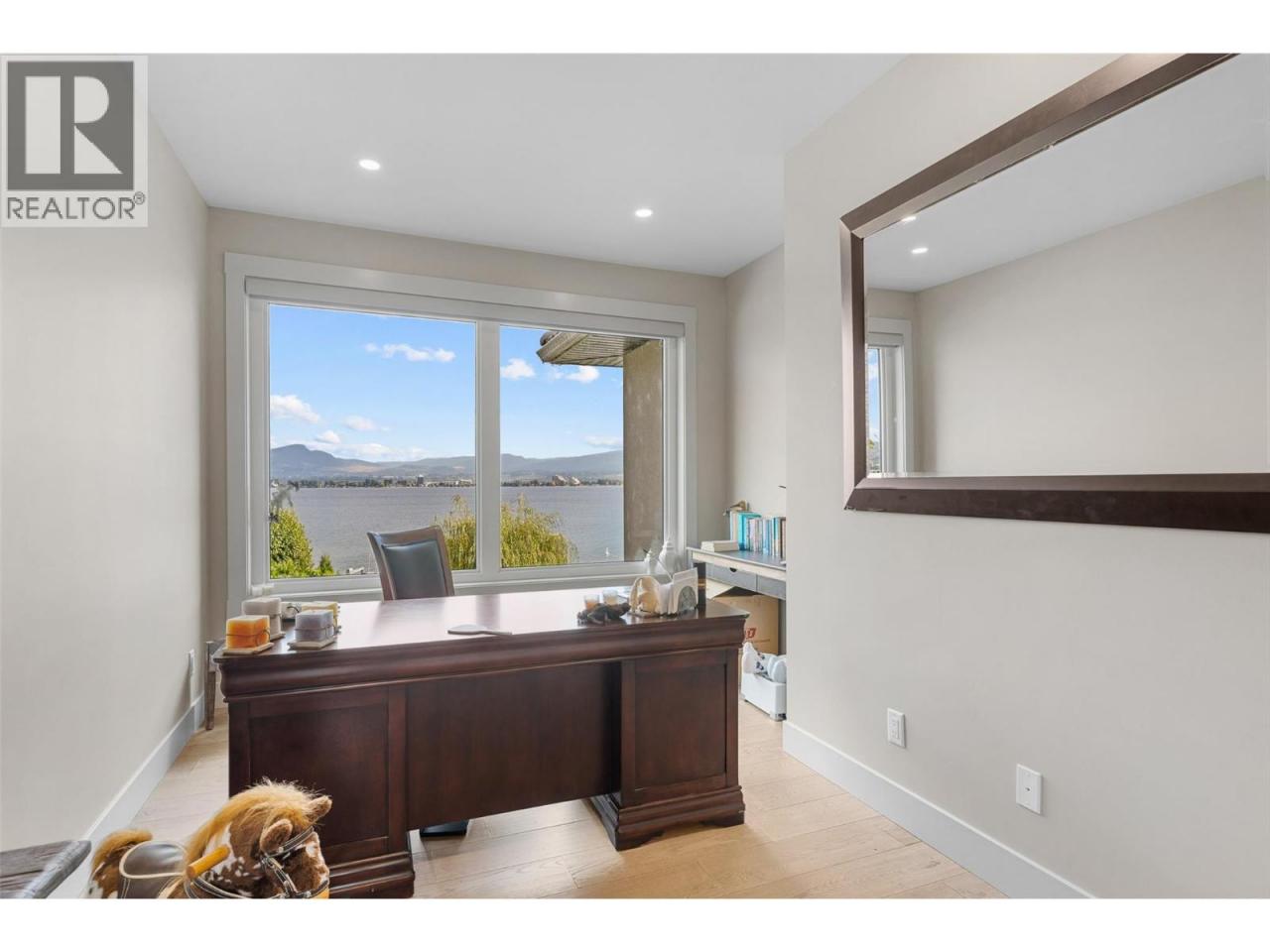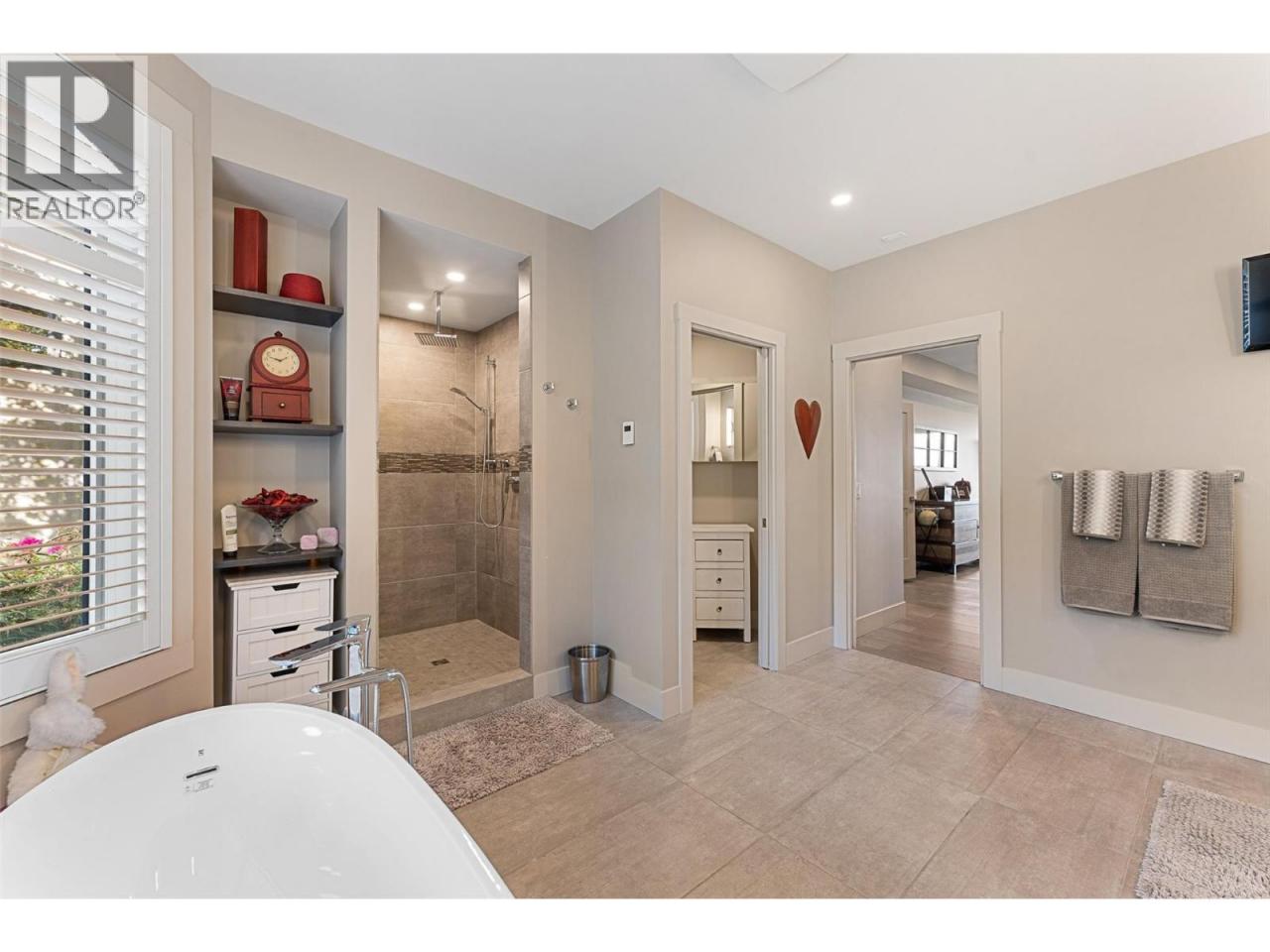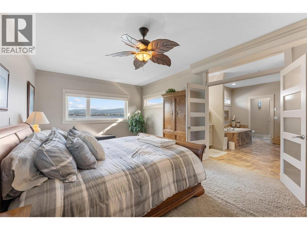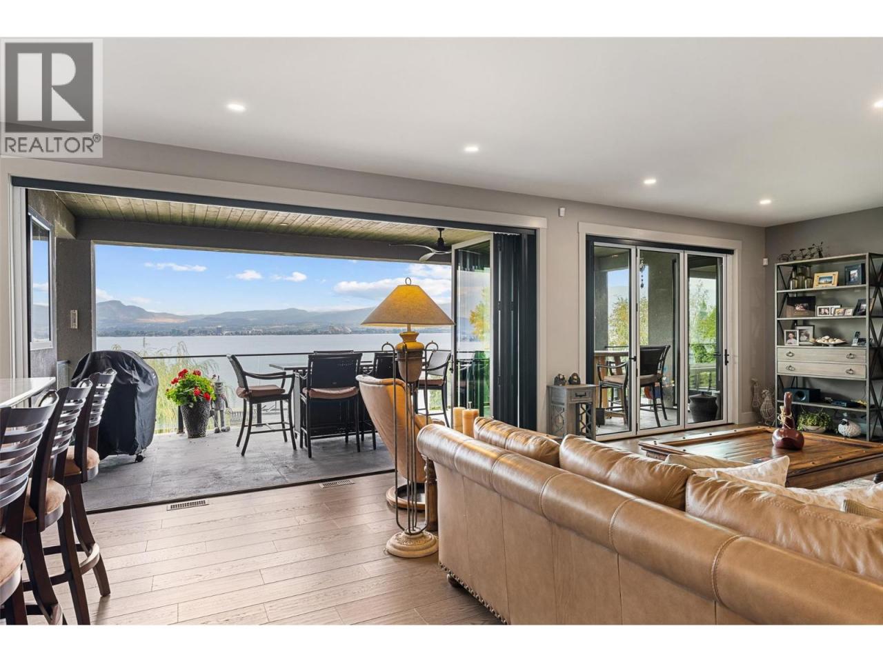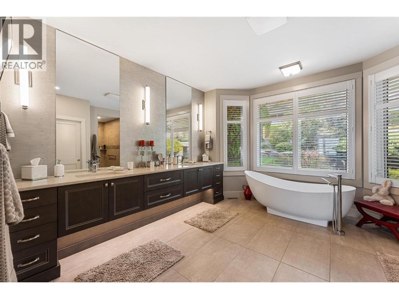 Nestled on a quiet cul de sac in a private waterfront setting, this beautiful customized residence offers a rare opportunity to experience tranquil living on the shores of Okanagan Lake. Surrounded by mature gently sloping grounds, the home blends refined design with a relaxed, resort-inspired lifestyle. Panoramic city and lake view and just minutes into town! A grand foyer with soaring ceilings, skylights and a graceful curved staircase welcomes you inside. The main living area unfolds beneath expansive windows and wall-to-wall Nano doors that open to the covered lakeside deck, creating seamless indoor-outdoor living just steps from the water. At the heart of the home, the chef’s kitchen featuring two islands, including a large L-shaped island with seating for seven, stone countertops, premium Thermador appliances and an oversized walk-in pantry. The primary retreat offers deck access, a custom walk-in closet and a spa-inspired ensuite with heated floors, a freestanding soaker tub and a fully tiled walk-in shower. Additional bedrooms on the upper level provide privacy for family and guests, including a second primary-style suite. The lower level is designed for relaxation with a spacious rec room, temp-controlled wine room, guest suite and walk-out access to the covered patio and backyard. All levels with elevator access! Outside, tiered landscaping leads to a sandy beach and a dock with boat and Seadoo lifts. Heated triple garage and generous driveway parking. (id:6769)