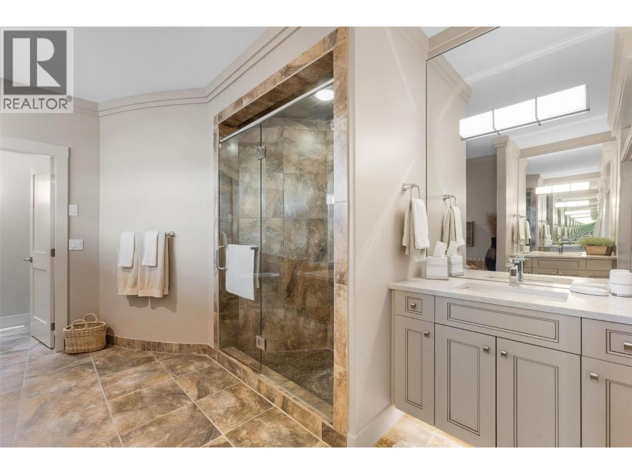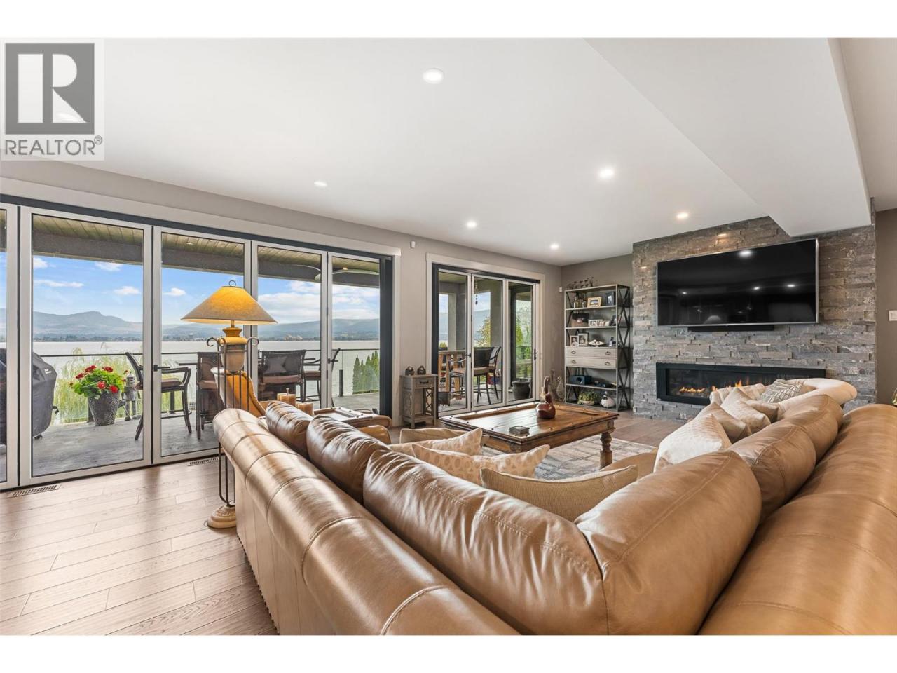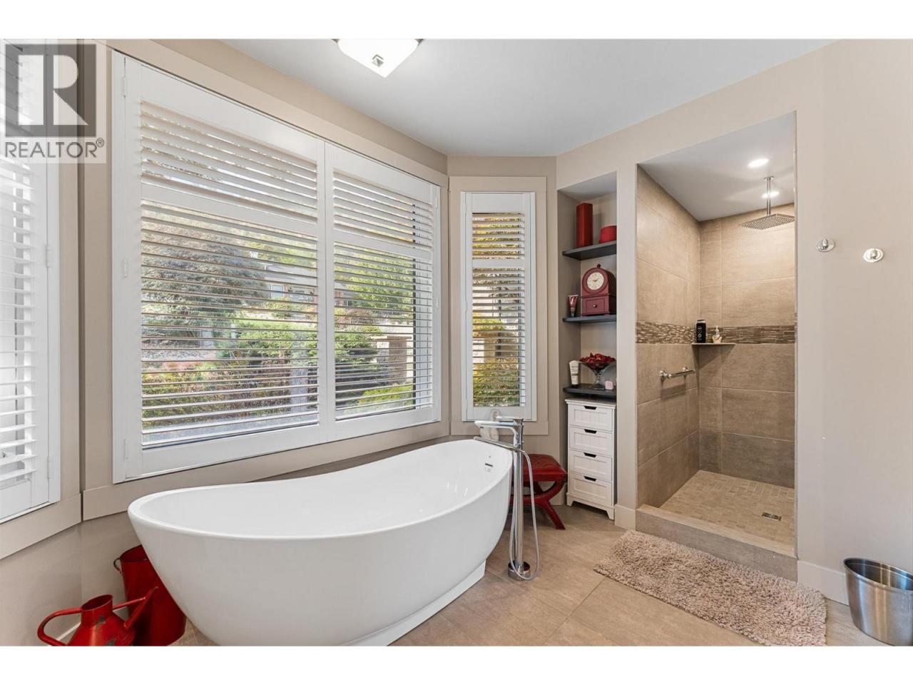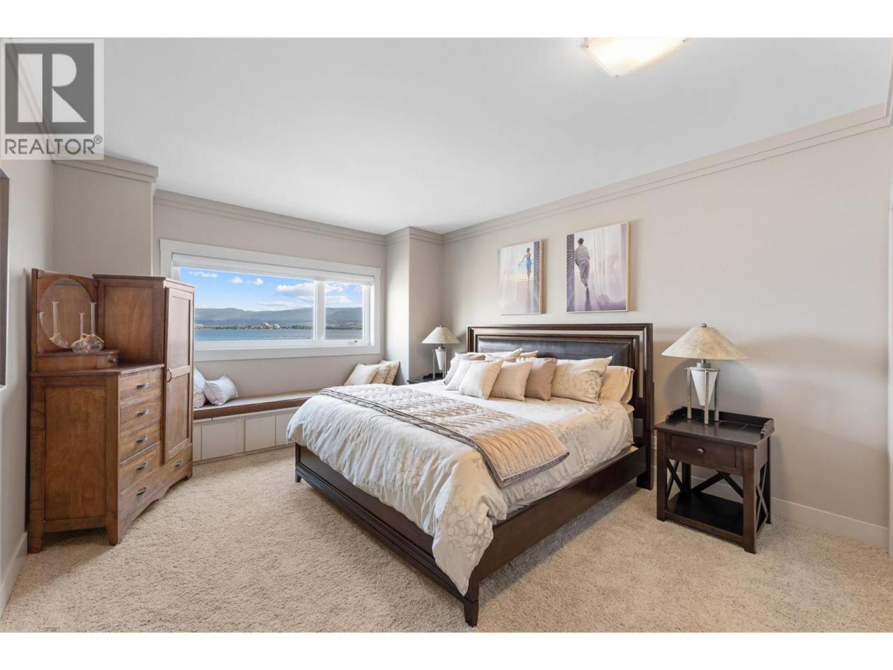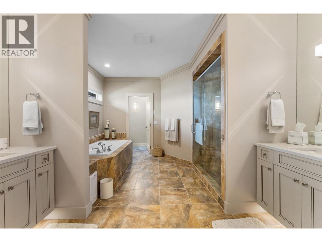 Nestled on a quiet cul de sac in a private waterfront setting, this beautiful customized residence offers a rare opportunity to experience tranquil living on the shores of Okanagan Lake. Surrounded by mature gently sloping grounds, the home blends refined design with a relaxed, resort-inspired lifestyle. Panoramic city and lake view and just minutes into town! A grand foyer with soaring ceilings, skylights and a graceful curved staircase welcomes you inside. The main living area unfolds beneath expansive windows and wall-to-wall Nano doors that open to the covered lakeside deck, creating seamless indoor-outdoor living just steps from the water. At the heart of the home, the chef’s kitchen featuring two islands, including a large L-shaped island with seating for seven, stone countertops, premium Thermador appliances and an oversized walk-in pantry. The primary retreat offers deck access, a custom walk-in closet and a spa-inspired ensuite with heated floors, a freestanding soaker tub and a fully tiled walk-in shower. Additional bedrooms on the upper level provide privacy for family and guests, including a second primary-style suite. The lower level is designed for relaxation with a spacious rec room, temp-controlled wine room, guest suite and walk-out access to the covered patio and backyard. All levels with elevator access! Outside, tiered landscaping leads to a sandy beach and a dock with boat and Seadoo lifts. Heated triple garage and generous driveway parking. (id:6769)