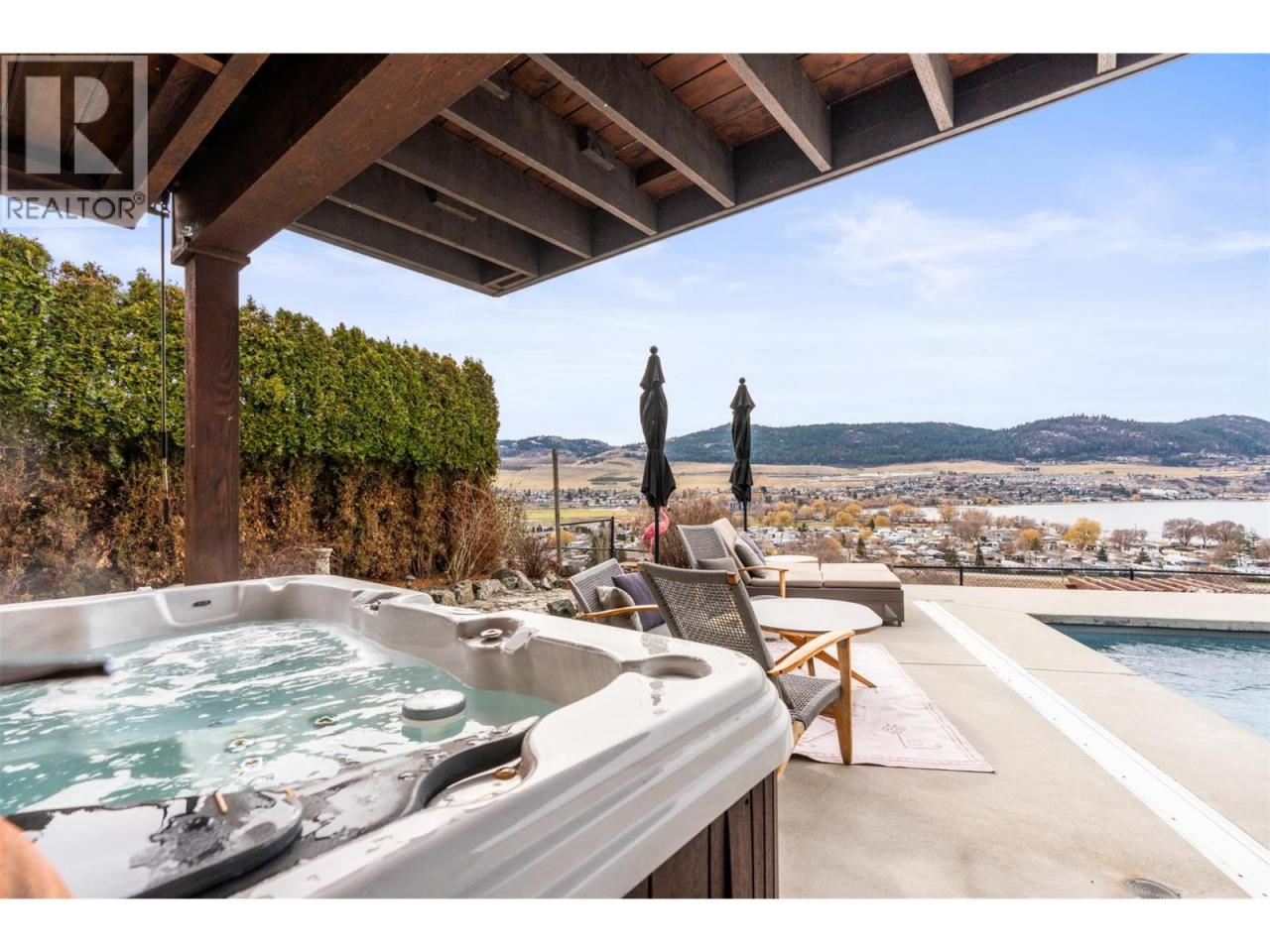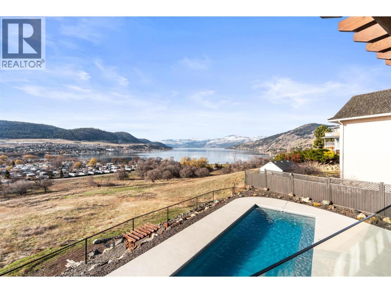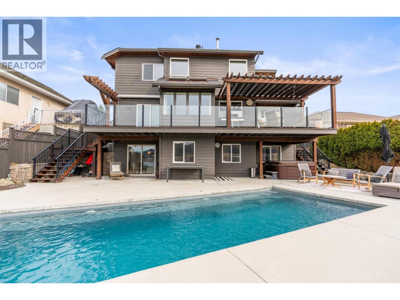 Enjoy breathtaking panoramic, unobstructed views down Okanagan Lake from this beautifully maintained home on sought-after Cameo Drive North in Bella Vista. Designed for true Okanagan living, the private backyard features an in-ground fiberglass pool with a brand-new heater, hot tub, tranquil waterfall and pond, and mature low-maintenance landscaping. Take in the ever-changing scenery of lake, sky, and wildlife while relaxing or entertaining in this exceptional setting. Inside, soaring vaulted ceilings and a graceful curved staircase create a bright, welcoming living space, while sunlight fills the home from sunrise to sunset. The home offers 4 bedrooms upstairs, with one thoughtfully converted to a convenient upper-level laundry room (easily converted back if desired), creating comfortable one-level living for families. The walk-out basement features a brand-new summer kitchen / in-law suite—perfect for poolside snacks and drinks, hosting guests, or accommodating extended family. Located just 5 minutes to the beach and only 2 minutes to golf, this property is surrounded by orchards, vineyards, and scenic walking trails including the Grey Canal Trail, with new wineries emerging nearby. Families will appreciate the excellent school catchment of Okanagan Landing Elementary and Clarence Fulton Secondary. Meticulously cared for and offering privacy, incredible views, and an exceptional lifestyle, this is a rare opportunity in one of Vernon’s most desirable neighbourhoods. (id:6769)