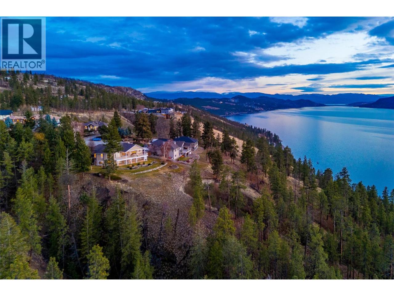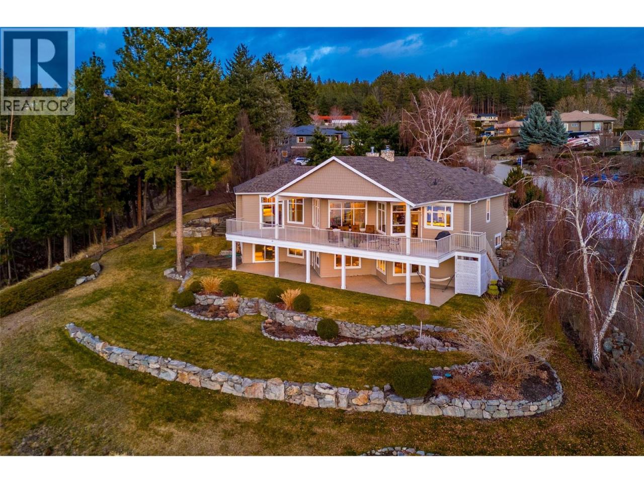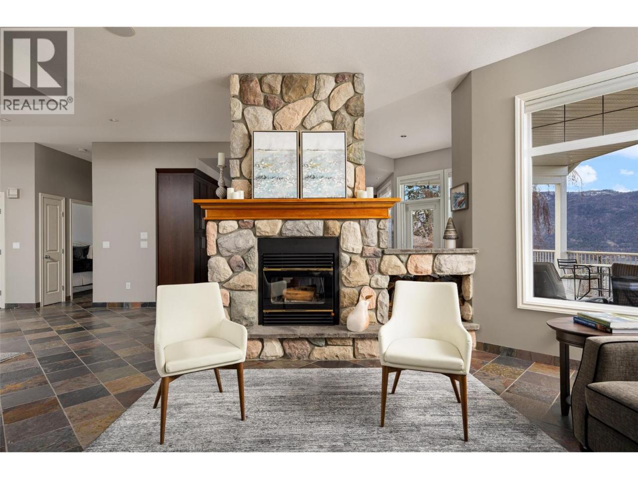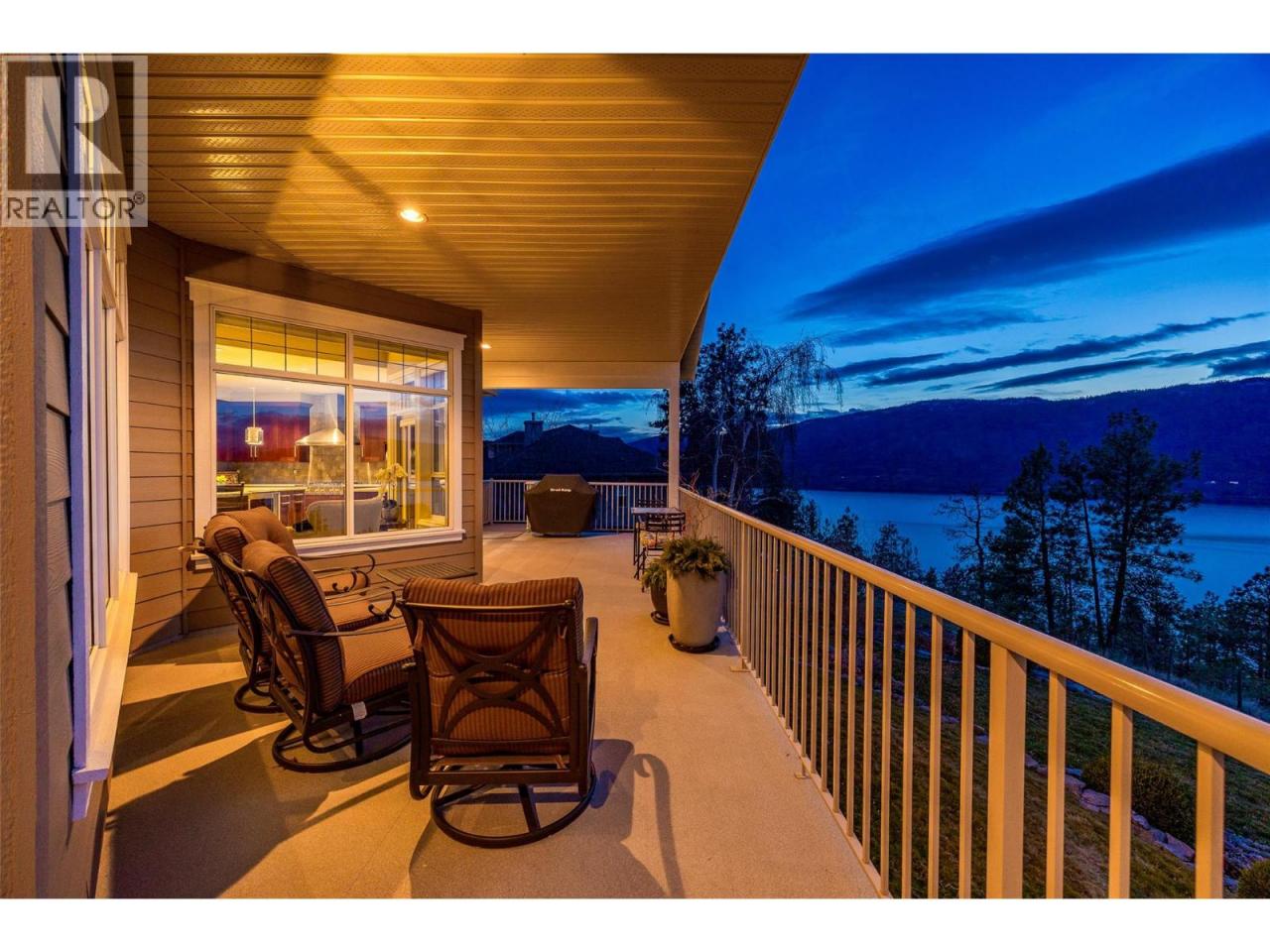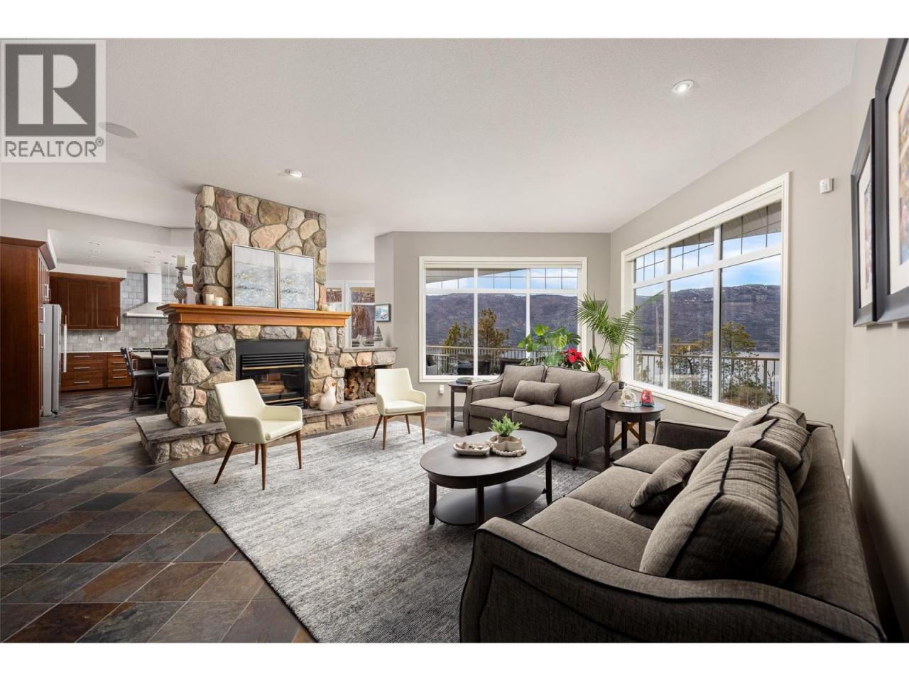 Set at the end of a quiet cul-de-sac within an exclusive community of just eight homes, this 1.3 acre property commands nearly 180-degree western views over Okanagan Lake and the surrounding mountains, offering unforgettable sunsets as your daily backdrop. This rancher with full walkout basement showcases exceptional craftsmanship and thoughtful design across more than 4,100 sq. ft. with 4 bedrooms, a den, gym and 4 bathrooms. The main level features ten foot ceilings, wide doorways, generous storage and an open-concept layout anchored by a striking two-sided wood-burning fireplace. The kitchen is both elegant and functional, appointed with granite countertops, a large island with seating for five, a 6-burner Jade gas range, KitchenAid appliances, wine fridge, under-mount lighting, automated blinds and Phantom screens for seamless indoor-outdoor living to a large balcony. Expansive living and dining areas, enhanced by surround sound on both levels, provide an elegant setting for hosting, easily accommodating large gatherings with comfort and atmosphere. The primary suite is a private retreat with lounge space, a spa-inspired ensuite with heated floors, steam shower, soaker tub, travertine counters, dual sinks and a spacious walk-in closet. A guest bedroom with tray ceiling, second full bath and large laundry room complete the upper level. Downstairs offers 8 foot ceilings, a gas fireplace, 2 bedrooms, a den/office with separate entrance and a substantial gym with wall-to-wall mirrors and oversized windows. A large recreation area offers flexibility to add a wet bar, and provides access to an ideal space for a future hot tub or sauna. Outdoors, over $60,000 in professional landscaping is supported by 21-zone irrigation, with ample room for a pool. An oversized two-car garage, flat driveway and parking for an RV complete this exceptional Okanagan offering. Only minutes from public beaches, a boat launch, world class wineries and exceptional hiking trails surrounding. (id:6769)