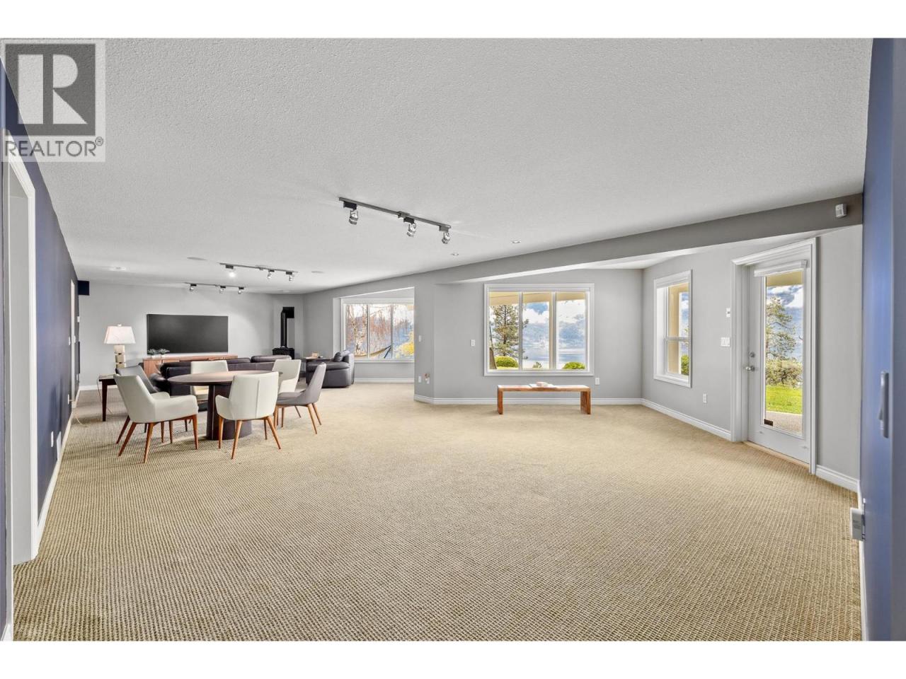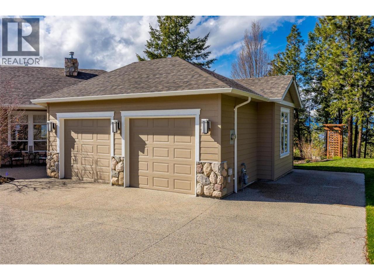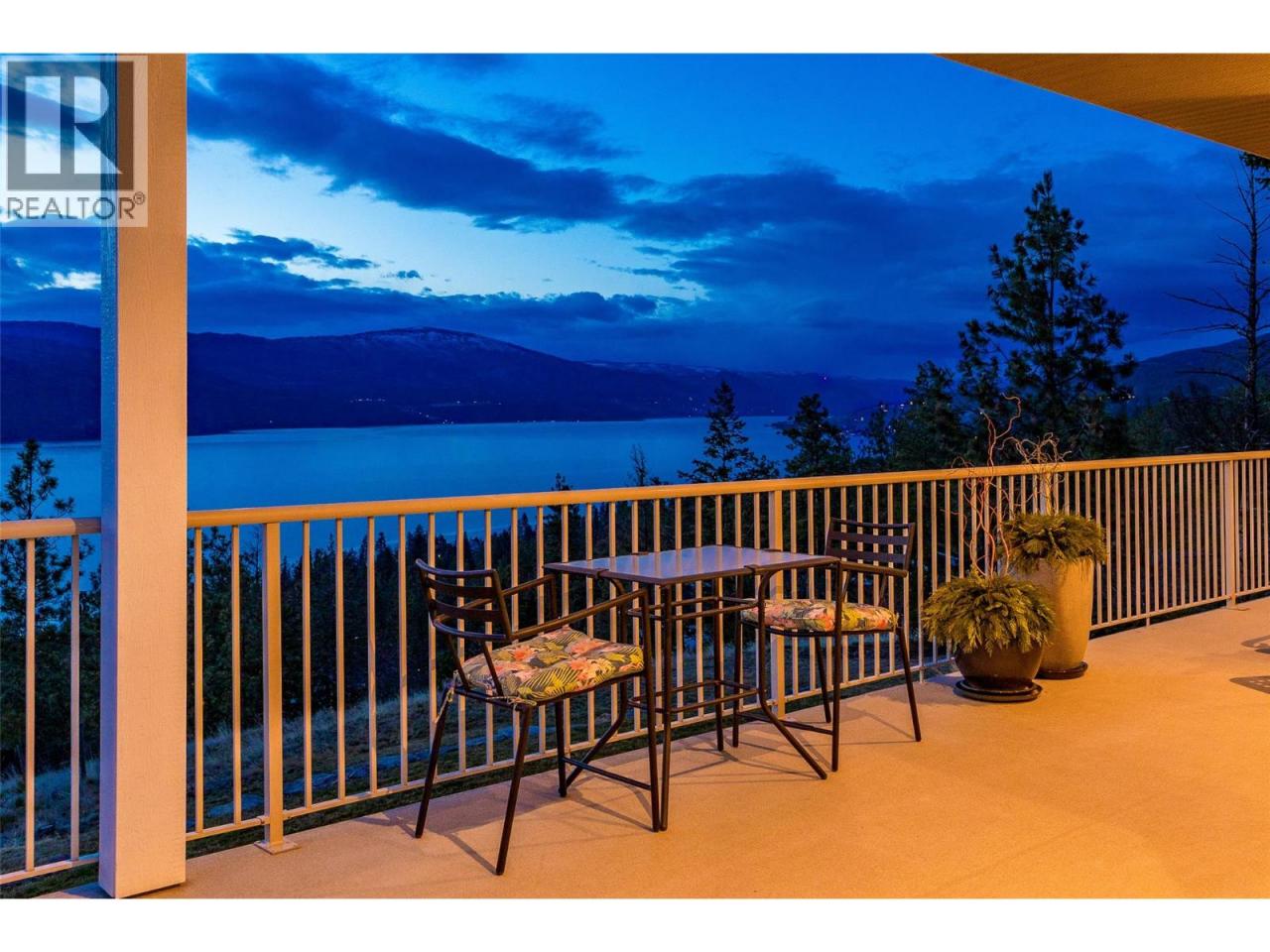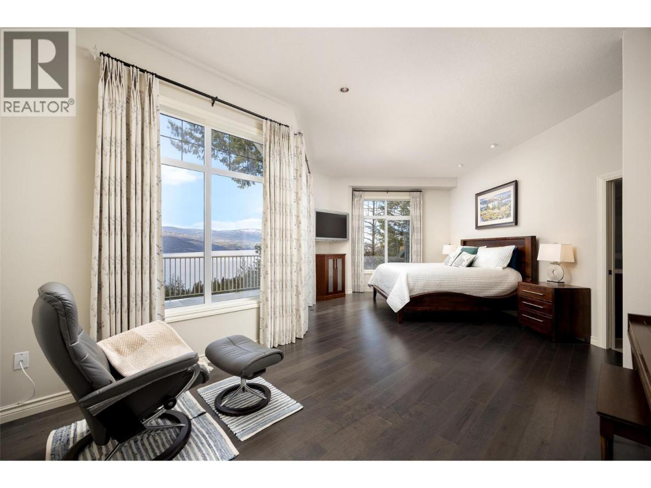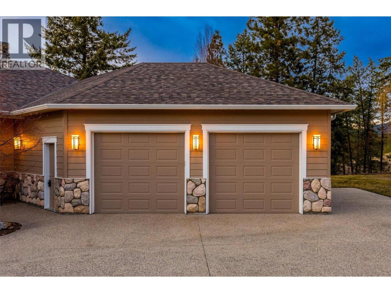 Set at the end of a quiet cul-de-sac within an exclusive community of just eight homes, this 1.3 acre property commands nearly 180-degree western views over Okanagan Lake and the surrounding mountains, offering unforgettable sunsets as your daily backdrop. This rancher with full walkout basement showcases exceptional craftsmanship and thoughtful design across more than 4,100 sq. ft. with 4 bedrooms, a den, gym and 4 bathrooms. The main level features ten foot ceilings, wide doorways, generous storage and an open-concept layout anchored by a striking two-sided wood-burning fireplace. The kitchen is both elegant and functional, appointed with granite countertops, a large island with seating for five, a 6-burner Jade gas range, KitchenAid appliances, wine fridge, under-mount lighting, automated blinds and Phantom screens for seamless indoor-outdoor living to a large balcony. Expansive living and dining areas, enhanced by surround sound on both levels, provide an elegant setting for hosting, easily accommodating large gatherings with comfort and atmosphere. The primary suite is a private retreat with lounge space, a spa-inspired ensuite with heated floors, steam shower, soaker tub, travertine counters, dual sinks and a spacious walk-in closet. A guest bedroom with tray ceiling, second full bath and large laundry room complete the upper level. Downstairs offers 8 foot ceilings, a gas fireplace, 2 bedrooms, a den/office with separate entrance and a substantial gym with wall-to-wall mirrors and oversized windows. A large recreation area offers flexibility to add a wet bar, and provides access to an ideal space for a future hot tub or sauna. Outdoors, over $60,000 in professional landscaping is supported by 21-zone irrigation, with ample room for a pool. An oversized two-car garage, flat driveway and parking for an RV complete this exceptional Okanagan offering. Only minutes from public beaches, a boat launch, world class wineries and exceptional hiking trails surrounding. (id:6769)