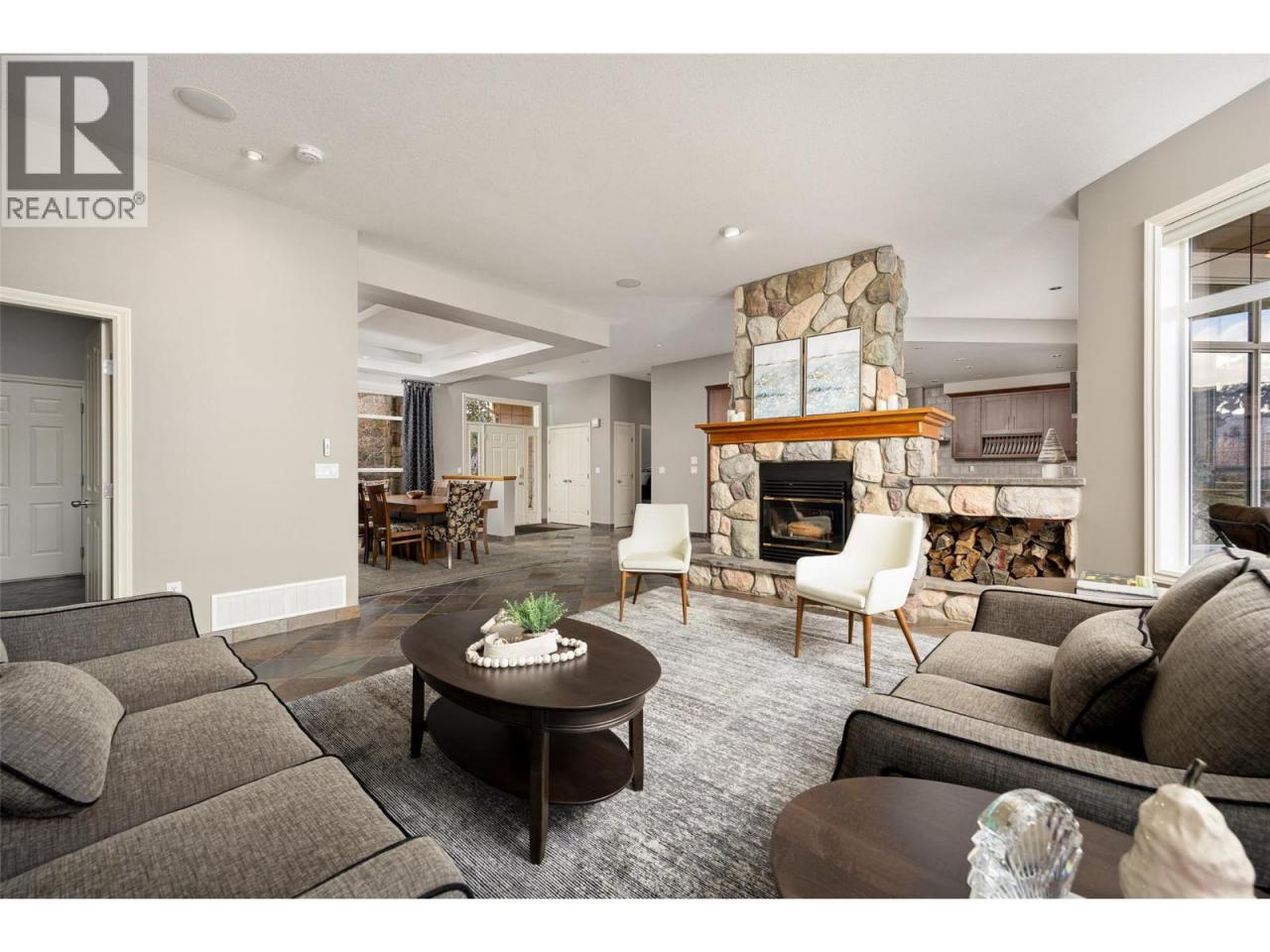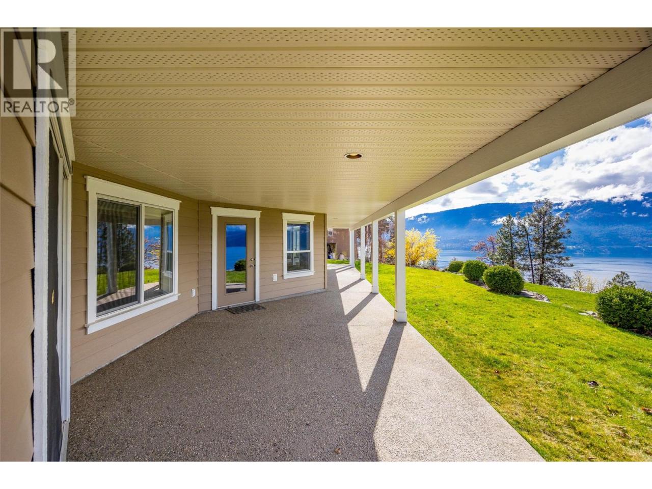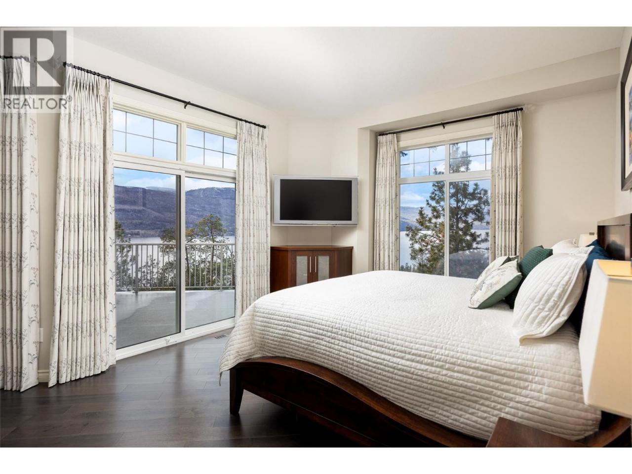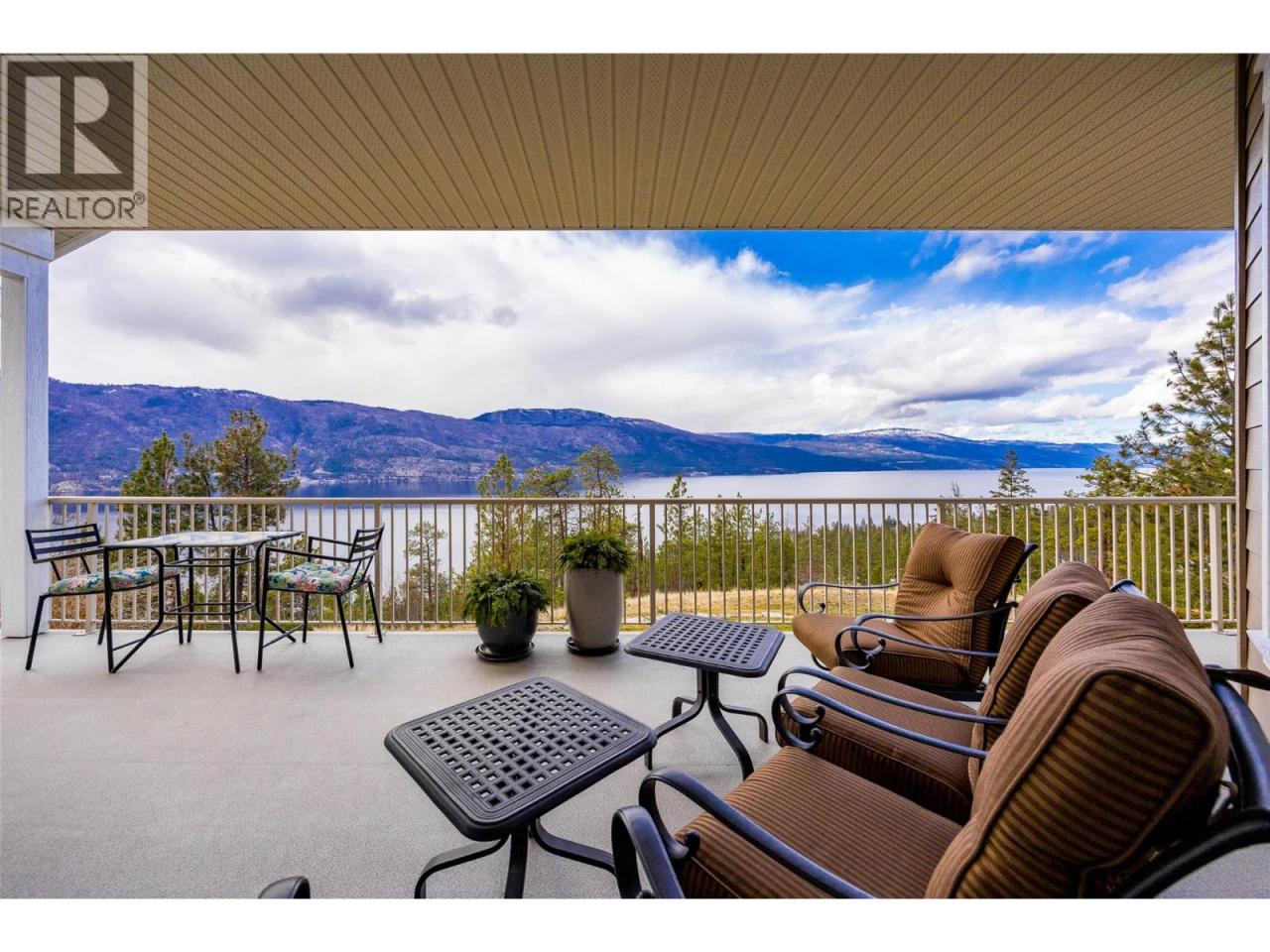 Set at the end of a quiet cul-de-sac within an exclusive community of just eight homes, this 1.3 acre property commands nearly 180-degree western views over Okanagan Lake and the surrounding mountains, offering unforgettable sunsets as your daily backdrop. This rancher with full walkout basement showcases exceptional craftsmanship and thoughtful design across more than 4,100 sq. ft. with 4 bedrooms, a den, gym and 4 bathrooms. The main level features ten foot ceilings, wide doorways, generous storage and an open-concept layout anchored by a striking two-sided wood-burning fireplace. The kitchen is both elegant and functional, appointed with granite countertops, a large island with seating for five, a 6-burner Jade gas range, KitchenAid appliances, wine fridge, under-mount lighting, automated blinds and Phantom screens for seamless indoor-outdoor living to a large balcony. Expansive living and dining areas, enhanced by surround sound on both levels, provide an elegant setting for hosting, easily accommodating large gatherings with comfort and atmosphere. The primary suite is a private retreat with lounge space, a spa-inspired ensuite with heated floors, steam shower, soaker tub, travertine counters, dual sinks and a spacious walk-in closet. A guest bedroom with tray ceiling, second full bath and large laundry room complete the upper level. Downstairs offers 8 foot ceilings, a gas fireplace, 2 bedrooms, a den/office with separate entrance and a substantial gym with wall-to-wall mirrors and oversized windows. A large recreation area offers flexibility to add a wet bar, and provides access to an ideal space for a future hot tub or sauna. Outdoors, over $60,000 in professional landscaping is supported by 21-zone irrigation, with ample room for a pool. An oversized two-car garage, flat driveway and parking for an RV complete this exceptional Okanagan offering. Only minutes from public beaches, a boat launch, world class wineries and exceptional hiking trails surrounding. (id:6769)