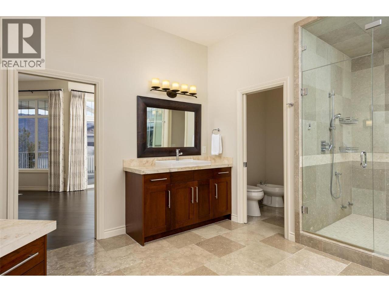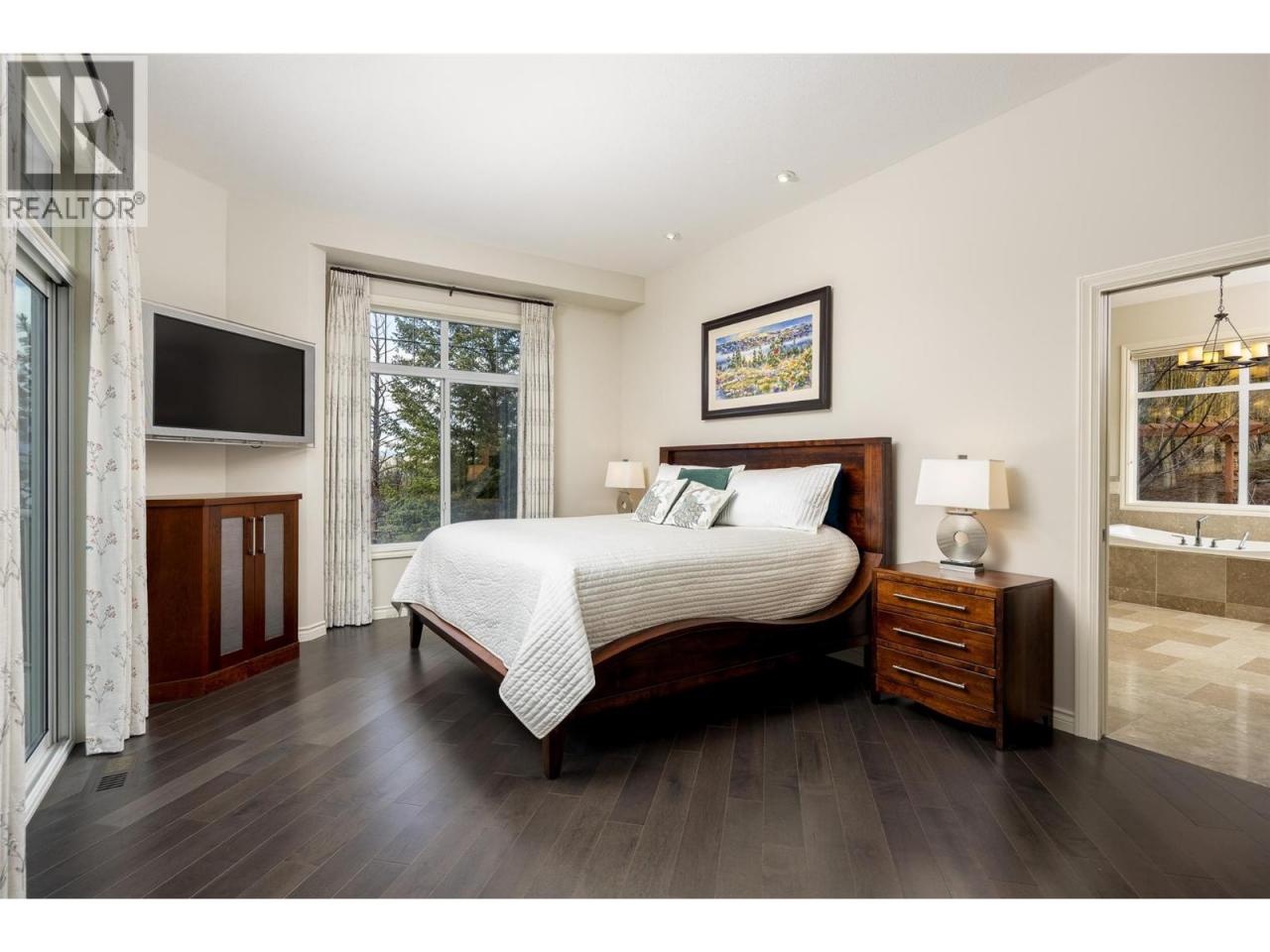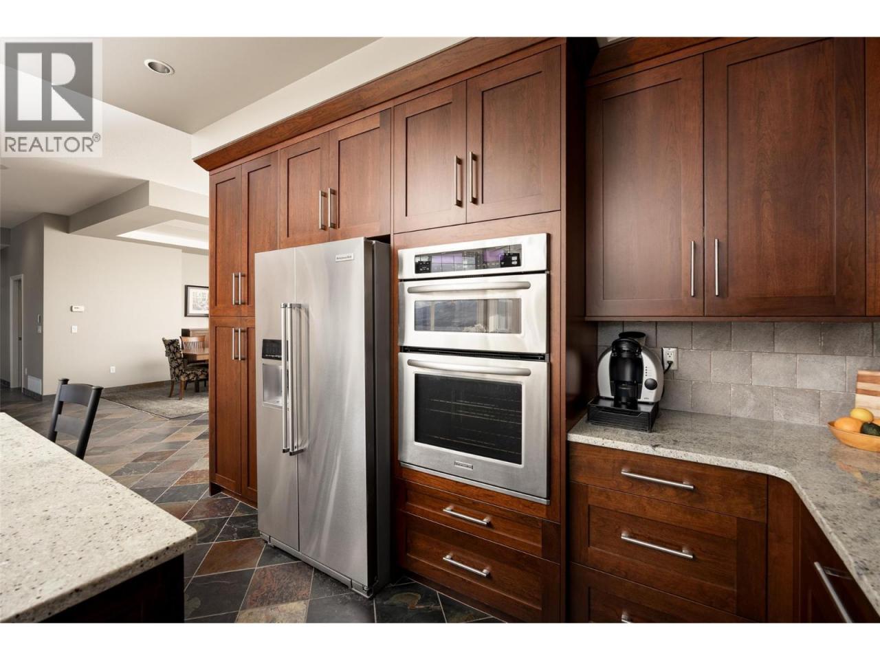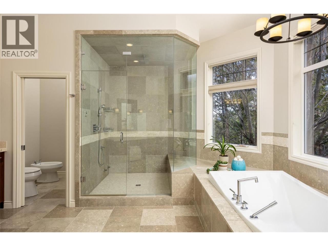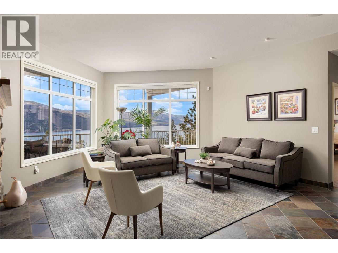 Set at the end of a quiet cul-de-sac within an exclusive community of just eight homes, this 1.3 acre property commands nearly 180-degree western views over Okanagan Lake and the surrounding mountains, offering unforgettable sunsets as your daily backdrop. This rancher with full walkout basement showcases exceptional craftsmanship and thoughtful design across more than 4,100 sq. ft. with 4 bedrooms, a den, gym and 4 bathrooms. The main level features ten foot ceilings, wide doorways, generous storage and an open-concept layout anchored by a striking two-sided wood-burning fireplace. The kitchen is both elegant and functional, appointed with granite countertops, a large island with seating for five, a 6-burner Jade gas range, KitchenAid appliances, wine fridge, under-mount lighting, automated blinds and Phantom screens for seamless indoor-outdoor living to a large balcony. Expansive living and dining areas, enhanced by surround sound on both levels, provide an elegant setting for hosting, easily accommodating large gatherings with comfort and atmosphere. The primary suite is a private retreat with lounge space, a spa-inspired ensuite with heated floors, steam shower, soaker tub, travertine counters, dual sinks and a spacious walk-in closet. A guest bedroom with tray ceiling, second full bath and large laundry room complete the upper level. Downstairs offers 8 foot ceilings, a gas fireplace, 2 bedrooms, a den/office with separate entrance and a substantial gym with wall-to-wall mirrors and oversized windows. A large recreation area offers flexibility to add a wet bar, and provides access to an ideal space for a future hot tub or sauna. Outdoors, over $60,000 in professional landscaping is supported by 21-zone irrigation, with ample room for a pool. An oversized two-car garage, flat driveway and parking for an RV complete this exceptional Okanagan offering. Only minutes from public beaches, a boat launch, world class wineries and exceptional hiking trails surrounding. (id:6769)