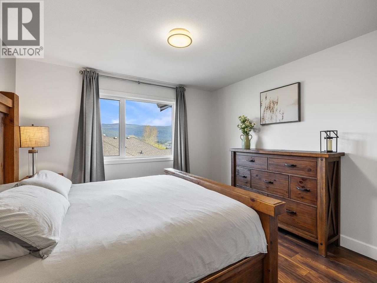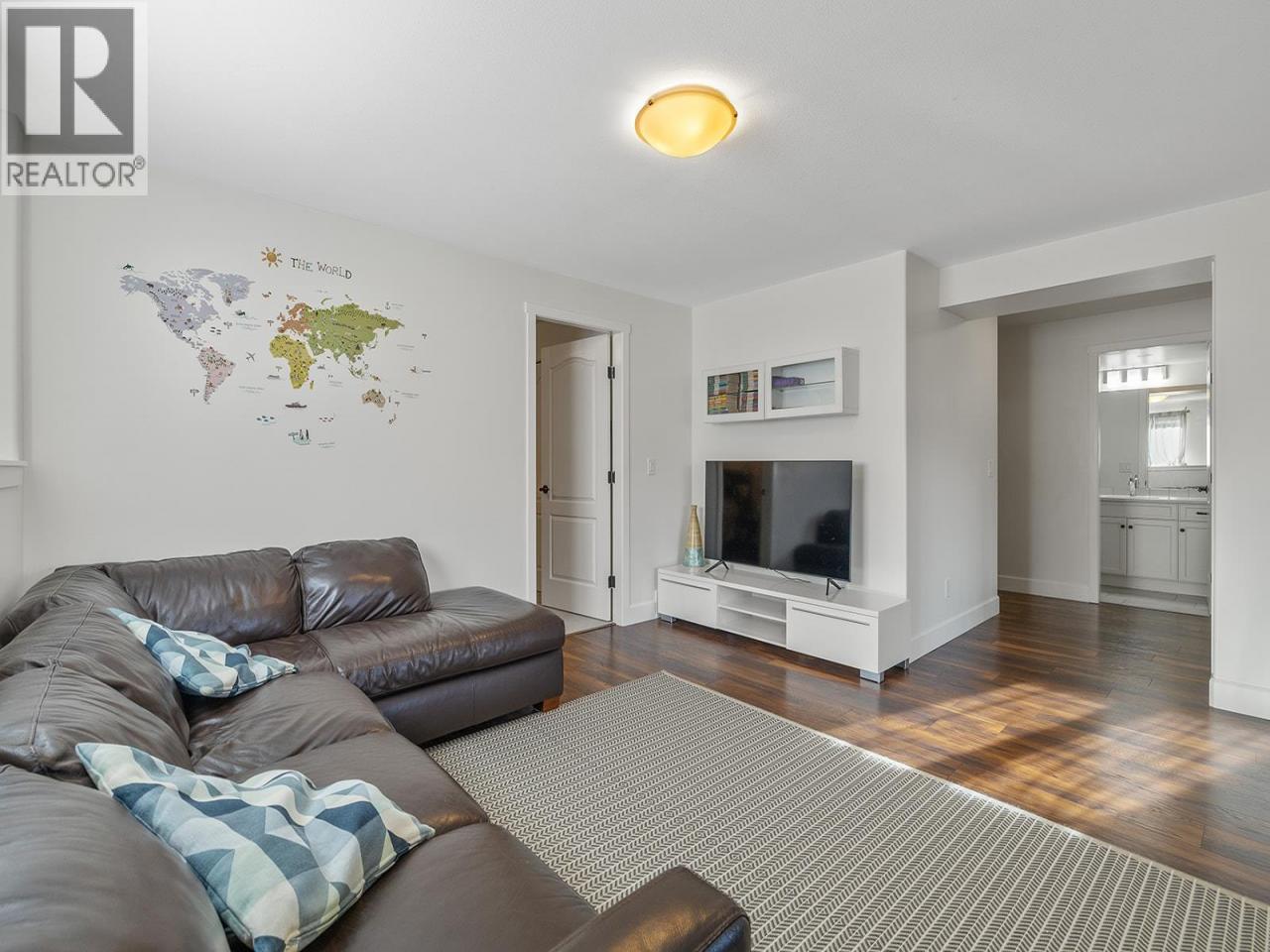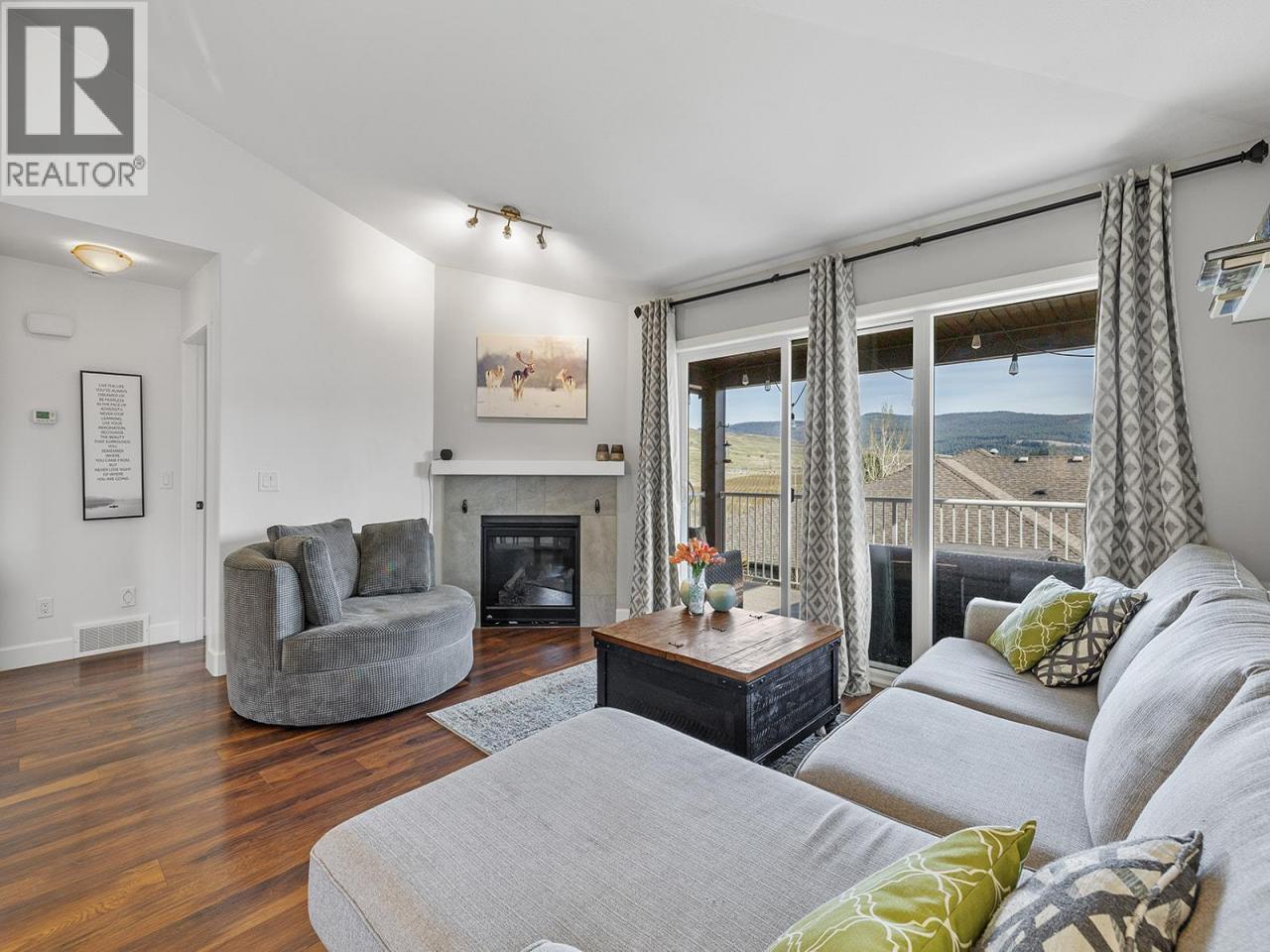 Mountain views and a cul-de-sac address in Black Mountain, this 4-bed, 3-bath walkout rancher in the Blackstone complex delivers low-maintenance living without compromise. The main floor flows through a bright living and dining area with vaulted ceilings and a gas fireplace, opening to a covered deck where the valley and mountain views take centre stage. The kitchen features quartz countertops, a gas range, and an island, built for the way you actually cook and entertain. The primary suite includes a full 4-piece ensuite, with a second bedroom, full bath, and main floor laundry rounding out the main level. Downstairs, the fully finished walkout basement, with its own separate side entrance, adds two more bedrooms, a large rec room, full bath, and generous storage, ideal for guests, teens, or a home office. Outside is a fully fenced landscaped yard with underground irrigation, stone and vinyl exterior, and a double attached garage with two additional uncovered stalls. Steps away from Black Mountain Golf Course, parks, hiking trails, schools, and transit. No thru street. Move-in ready. (id:6769)