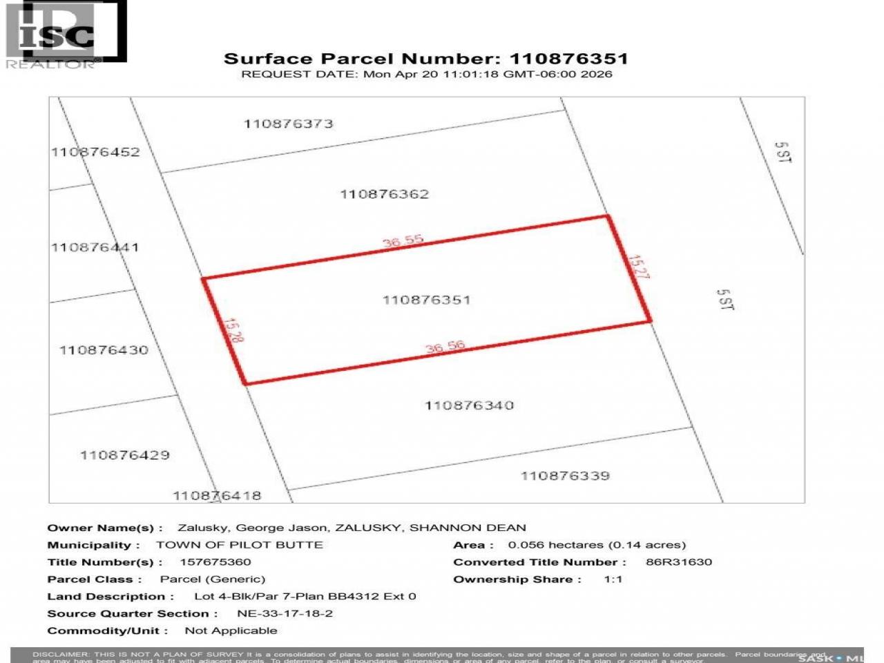 Build Your Dream Home in Pilot Butte! Prime opportunity to own a 50’ x 120’ vacant lot located in the well established and desirable community of Pilot Butte. This generous residential lot provides the perfect setting to design and build your custom home in a quiet, family-friendly neighbourhood. No services currently connected. Purchaser responsible for all utility connections (power, gas, water, and sewer) and associated costs. Pilot Butte offers a strong sense of community and a variety of local features and amenities including a K-8 school, daycare, parks, walking paths, recreation facilities, community centre, shops, restaurants and nearby golf courses. Enjoy small-town living just minutes from Regina with easy access for commuting, shopping, and amenities. Whether you’re ready to build now or planning for the future, this is an excellent opportunity to secure a well-located lot in a growing community. Don’t miss out, start planning your dream home today! (id:6769)
